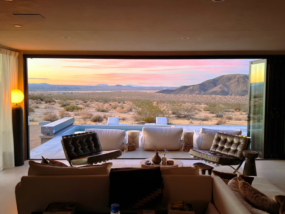 Welcome to "Eternal Sun", a modern, activity-packed masterpiece dropped just outside of Joshua Tree National Park. This home has desert views for days, and will impress even the harshest of critics. Truly an experiential stay with activities to do around every corner. You and your group will have the opportunity to stargaze from our heated pool with expansive desert views, play pool & ping pong outdoors, watch a movie in an outdoor theater, and take a soak in the hot tub under the milky way.