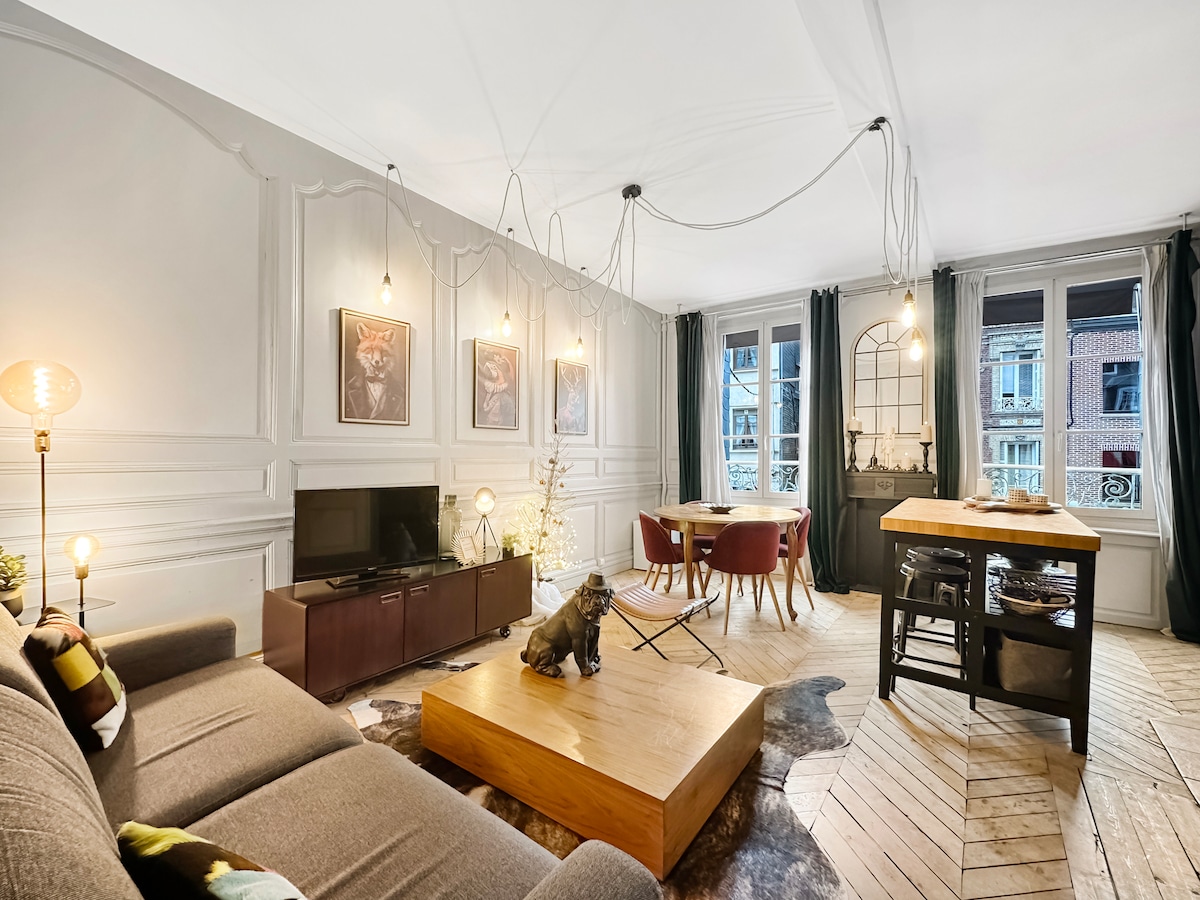 In the historic heart of Caen, next to the town hall and the Abbey of Men, fully renovated old apartment of 65 m2, bright ground floor overlooking courtyard and garden, including a fully equipped open kitchen, living room with sofa bed, double bed bedroom, bathroom with shower and bathtub. A south-facing terrace overlooking a sunny enclosed garden, parking possible in the courtyard. Television, Wi-Fi, ironing board and iron, hair dryer, towels and bed linen provided.
