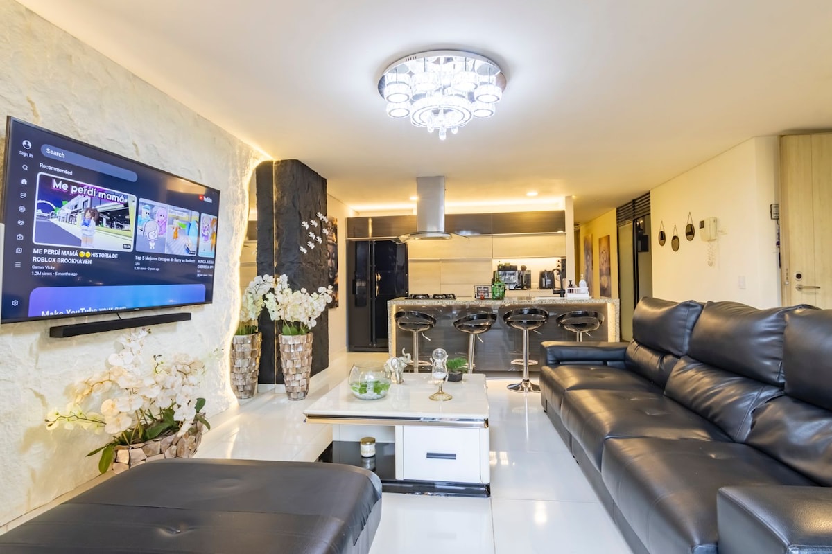 IMPORTANT! READ HOUSE RULES FIRST Step into a 2BR industrial-chic oasis on the 17th floor. Floor-to-ceiling windows frame breathtaking city views. The star is the cinema balcony with a TV & sofa—your private sky lounge! Enjoy resort-style amenities like a rooftop Jacuzzi, steam room & gym. Located opposite Viva Envigado mall for premier shopping & dining. The ultimate stylish escape.