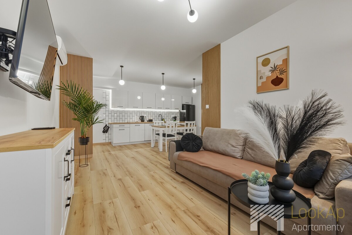 This modernly finished and furnished apartment is located in secured compound in the heart of the city of Lodz. Spacey living room with comfortable sofa, table and 4 chairs, TV cabinet and 55" TV with Play Station for with games as in the photo and with apps like Netflix, Apple Tv, Max, Prime is connected to fully equipped kitchen. Main bedroom queen size bed. Spare bedroom- double bed. One parking spot is dedicated for you, inside the secured area, next to the building.