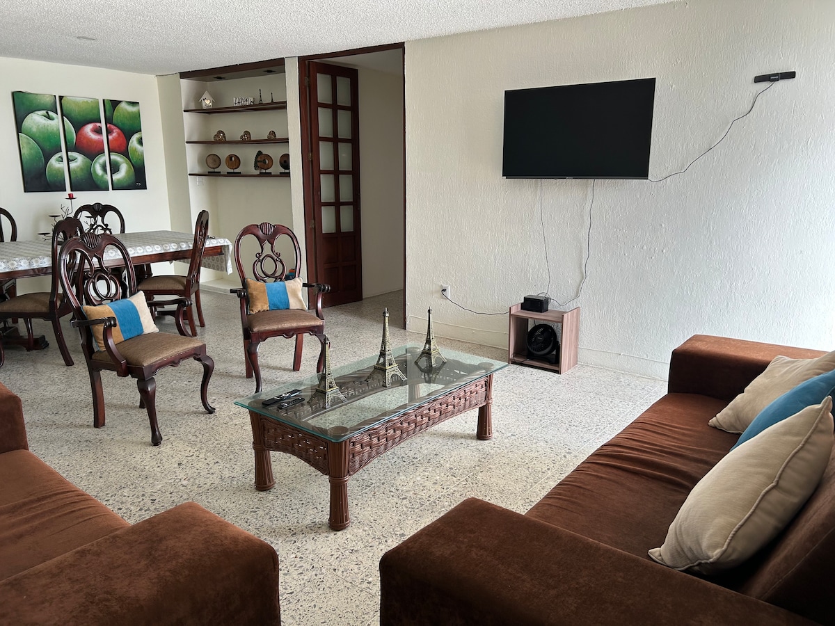 Confortable y seguro departamento con alberca para niños y adultos frente del centro comercial Forum. Este espacio es un departamento que cuenta con dos recamaras y dos baños completos. Una de las recamaras tiene cama doble y la otra dos camas individuales, además existe una sala de entretenimiento, una sala-comedor y una cocina que está perfectamente equipada y lista para usar. Casa Ofelita tiene WIFI, climas y ventiladores y un estacionamiento privado de fácil acceso.