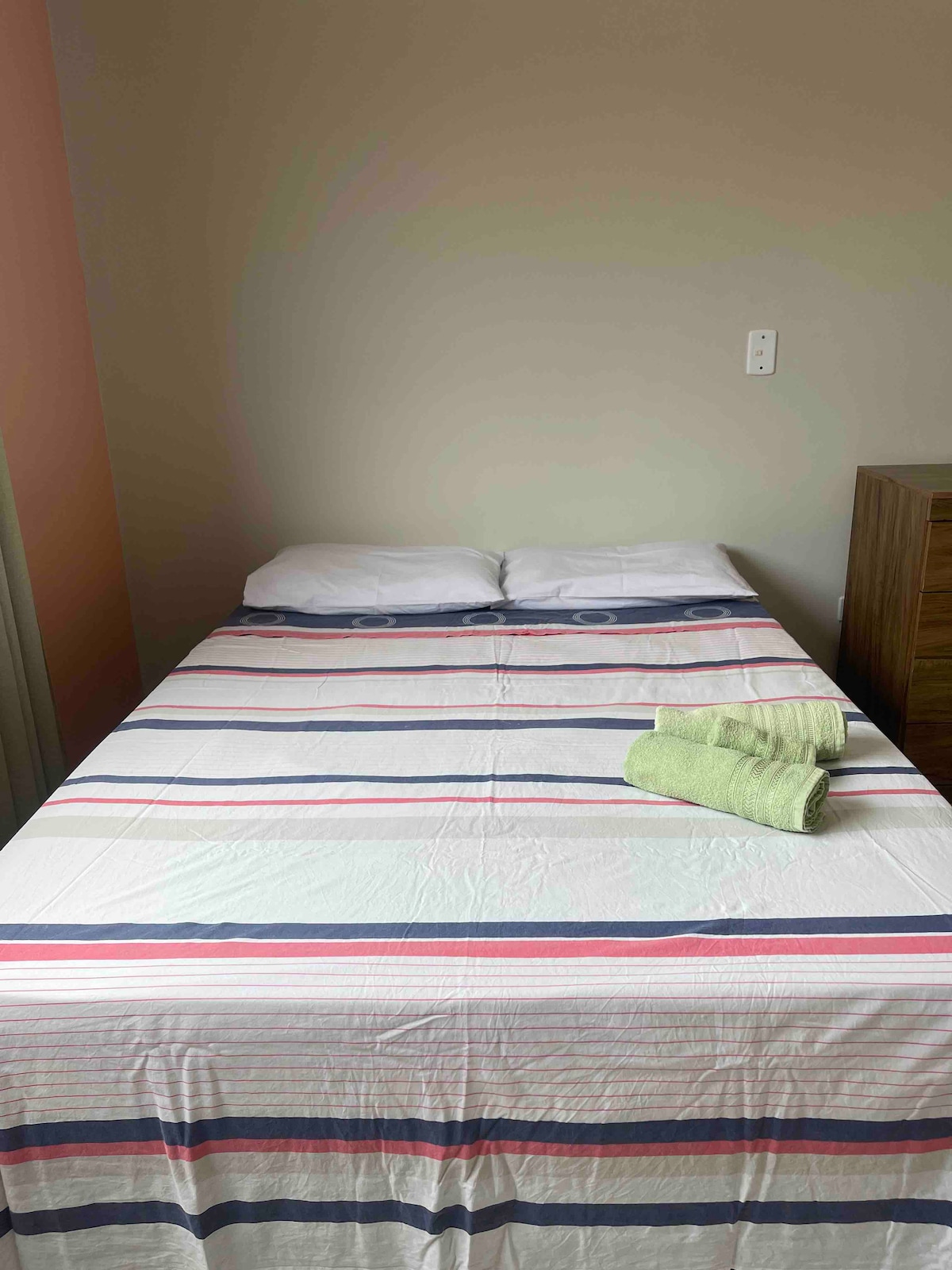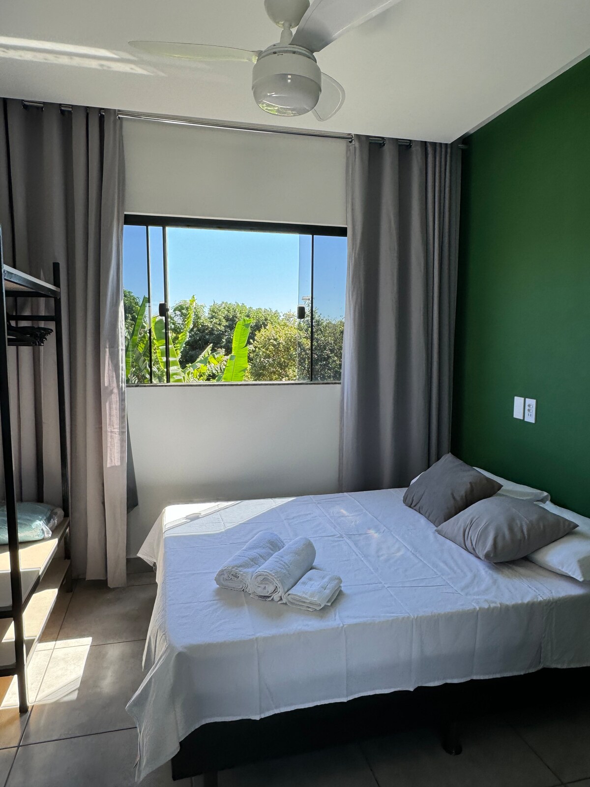 Modern and newly opened flat, green and quiet area with a strategic location. 🕒 Quick and convenient self check-in: The whole process takes less than 5 minutes, faster than a hotel! Here you have your own equipped kitchen, ideal for preparing meals with practicality, comfort and freedom. The space offers: Wired Internet and Wi-Fi, Double bed with bedding, Bathroom, Kitchen with refrigerator and cooktop, Blackout curtain, Table, Chairs, Mirror and Parking. Exclusive space for you.