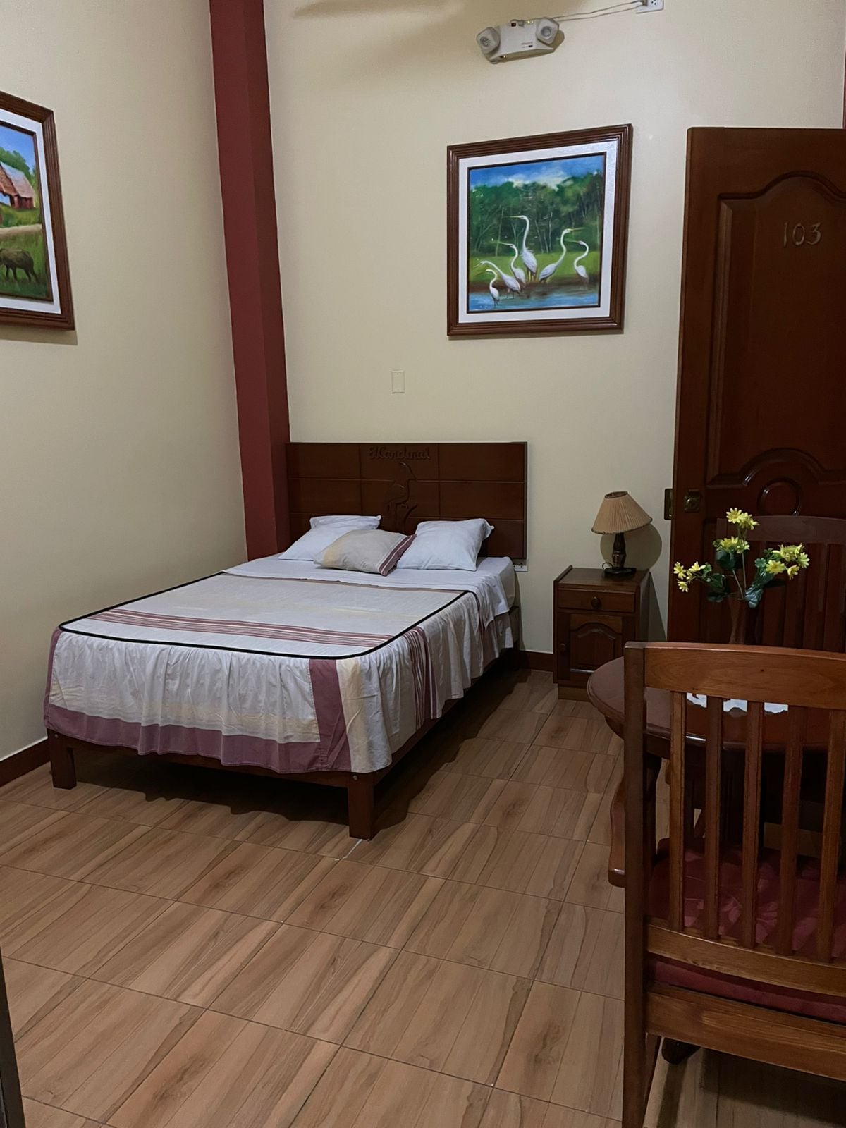 In this central room in the 2nd floor you can enjoy the simplicity and warmth with a bed of 2 squares (matrimonial), safe area (surveillance cameras), quiet and cozy; it is a beautiful place in our Peruvian Jungle.