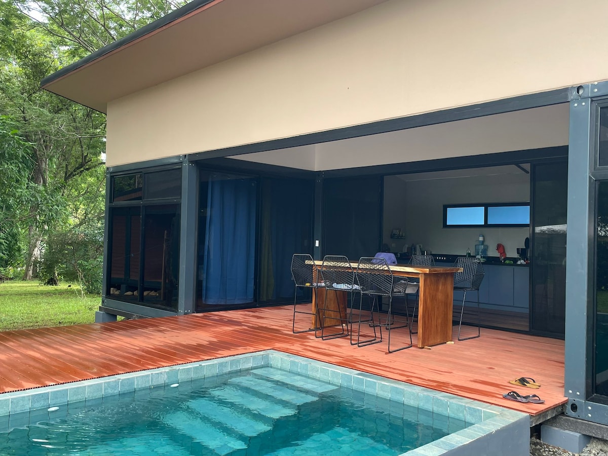 Nestled in the heart of the Costa Rican jungle, Banguni Villas is a peaceful retreat for couples or travelers seeking a slow escape. Surrounded by trees and wildlife, the villa offers a comfortable space with a spacious bedroom, modern amenities, and a strong connection to nature. The property includes only this villa and our home, set on the same land but well separated. Enjoy quiet mornings, relax by the shared saltwater pool, and visit nearby beaches like Playa Avellanas and Playa Negra.