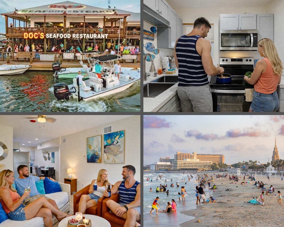 Howdy! Our vacation beach king bed suite is on the north Padre Island, the safest place in Corpus Christi. We are right on the canal and ground floor. No steps! Enjoy fishing from our private back porch and shared fishing docks. Beautiful water view at the updated Swimming pool and hot tub. One king bed in the bedroom, Daybed with a trundle & one queen sofa bed in the living room. Close to the beach and conveniently located to bars and restaurants. Come and enjoy this beach paradise.