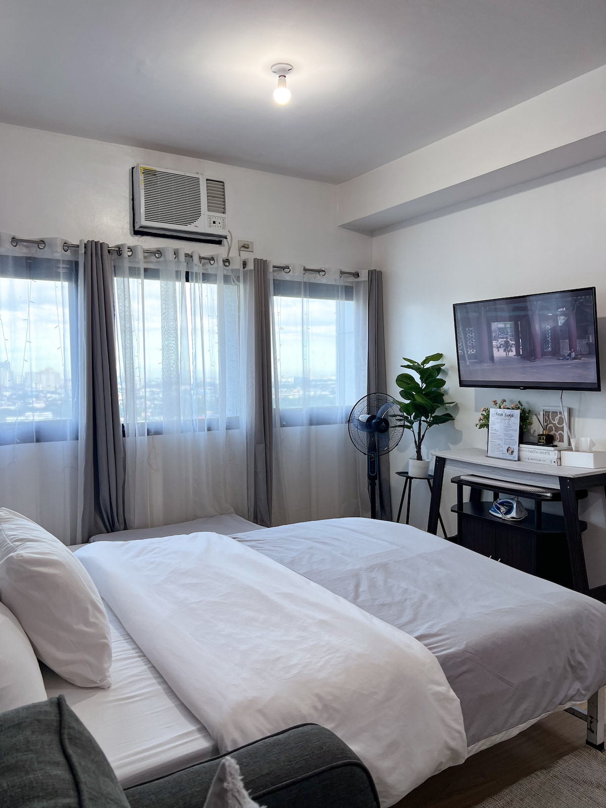 Fully furnished unit with divider for bedroom. Walking distance to groceries, convenience stores, restaurants, malls, banks, bars. Active night life! ❤ Pool, Sauna & Gym Access (w/ fee) ❤ 55" 4k UHD TV + A/C + Workspace ❤ Streaming apps available using your own account ❤ Coffee, fresh towels, and essentials provided ❤ Filtered & Alkaline Drinking Water ❤ Child & Dog-friendly ヅ Accessible paid parking off premises ヅ Reliable WiFi perfect for remote work
