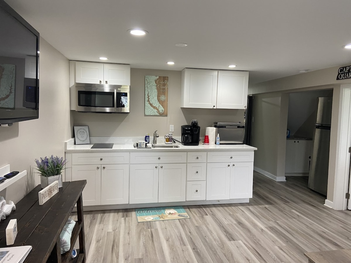 This is a two room above the garage apartment with a dedicated side entrance for guests separate from the main house by screens down and a barn door up. Once upstairs you have your own private space. Your mini fridge will always be stocked with an assortment of beverages and snacks as well as breakfast items. Enjoy, our kayaks, fire pit or sunset viewing on the pier. Lots of hiking and water sports abound in the area. A short drive south is Solomon’s island. This is a safe space for all🥰