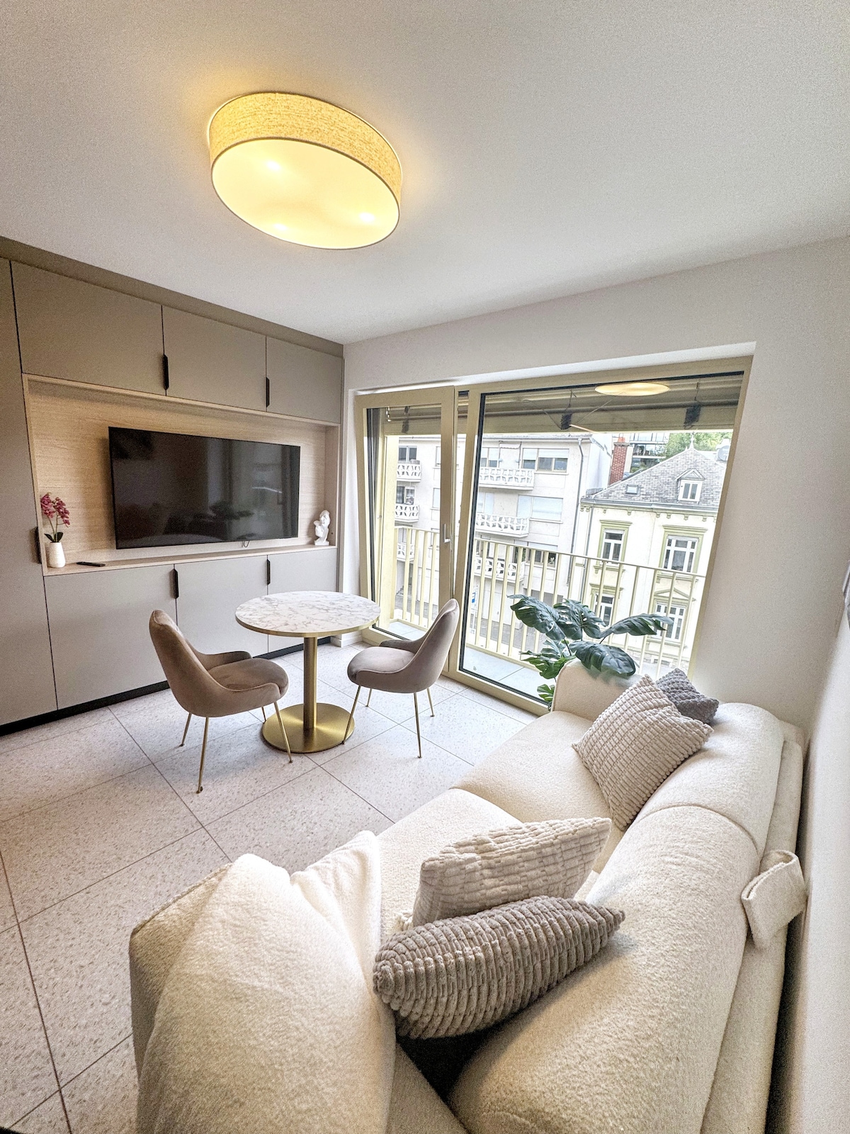 There’s no better way to experience the beauty of CITY than by sleeping right in the heart of it. Few steps away from shops, restaurants, parkhouse Hamilius in the building, pharmacy and more. This modern and luminous, 1-bedroom standard king size with a dedicated workspace offers you a large balcony with a high-rise view of the bustling streets and activities. Located in Luxembourg city you can find your peace thanks to the triple glazed windows and large walls. Tram&Bus-station in front.