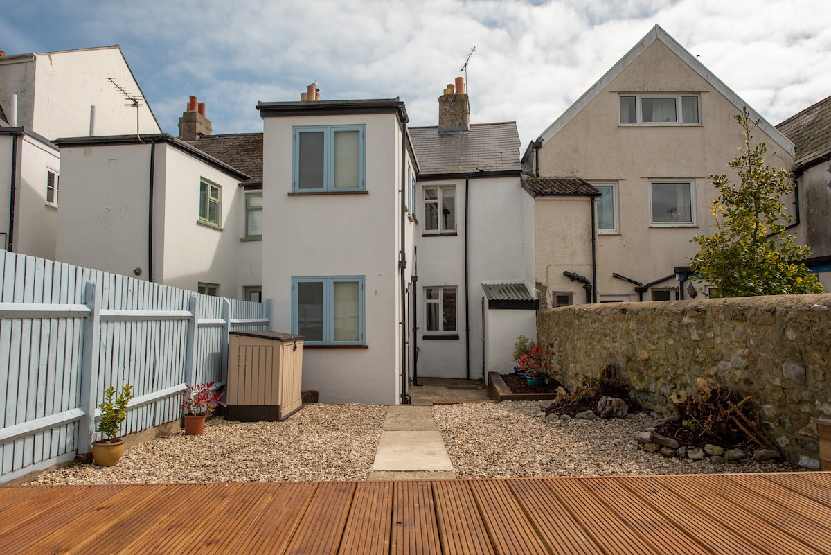 Quirky and private little apartment with a pretty patio garden. Hidden at the end of a secret pathway just behind the historic pedestrian Sherborne Lane. 6 minutes walk to the sandy beach through the beautiful Langmoor Gardens and a 2 minute walk to the top of the high street. Everything in the town is just minutes away but there are no roads nearby and so it is very peaceful. With lovely views from the patio garden across the town towards Black Venn cliffs.