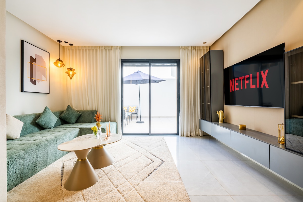 • Welcome to Linaz Living, in Oasis Casablanca! Modern 🔹studio with 1 bedroom, bright living room, equipped open-plan kitchen, Italian bathroom and terrace. 🔹Located on the ground floor with underground parking. 🔹2 min to Oasis and Maarif train station. 🔹2 min to the hospitals and all the shops. 🔹5 min to Hassan 2 Mosque - Marina Shopping - Saqala - Dar Dada • Comfort, quiet and perfect location for travelers, tourists or professionals.