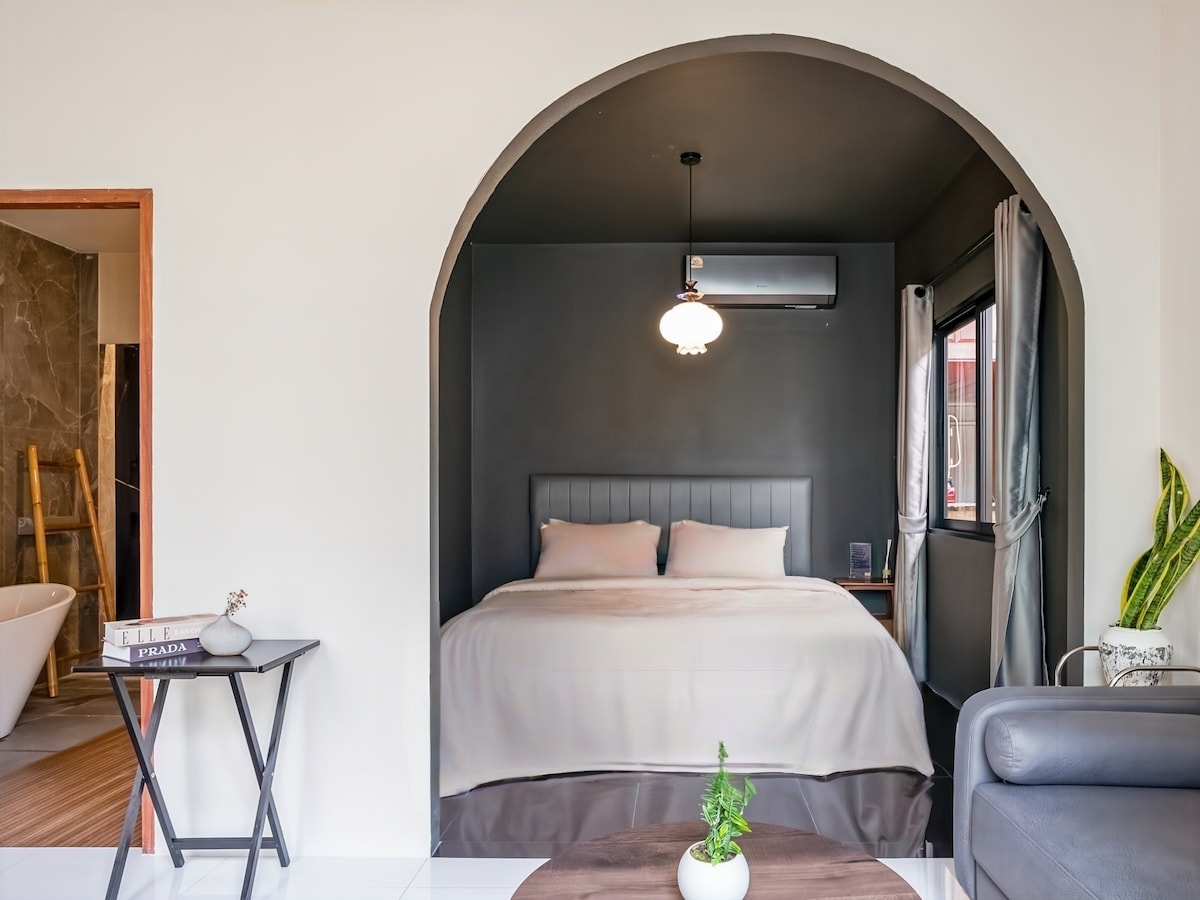 Bathe beneath the skylight — our signature concrete bathtub sits directly under an open skylight, so you soak in natural daylight or gaze at the stars after dark. This minimalist garden suite features a king bed, floor-to-ceiling windows overlooking serene gardens, and a workspace for digital nomads. The design is deliberately calm and uncluttered — a true zen escape in Pai's only design boutique hotel. Gardens, koi ponds, and Pai Night Market all within easy reach.