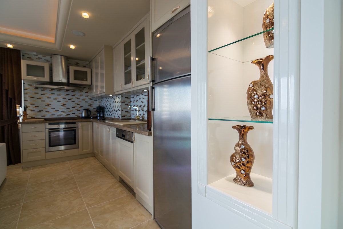 Peaceful, Magnificent Spacious Apartment with Sea View in the City Center. Suitable for long and short-term stays, you can message us. 24/7 security, 3 outdoor pools, Aquapark, Indoor pool, Fitness, Turkish Bath-Sauna, SPA, Playground, Market, Hairdresser, Restaurant, Pool bar, Tennis, Basketball and Football courts, Billiards-Bowling, Parking lot and cab stand. Electricity is paid according to usage, payment is made to the site management