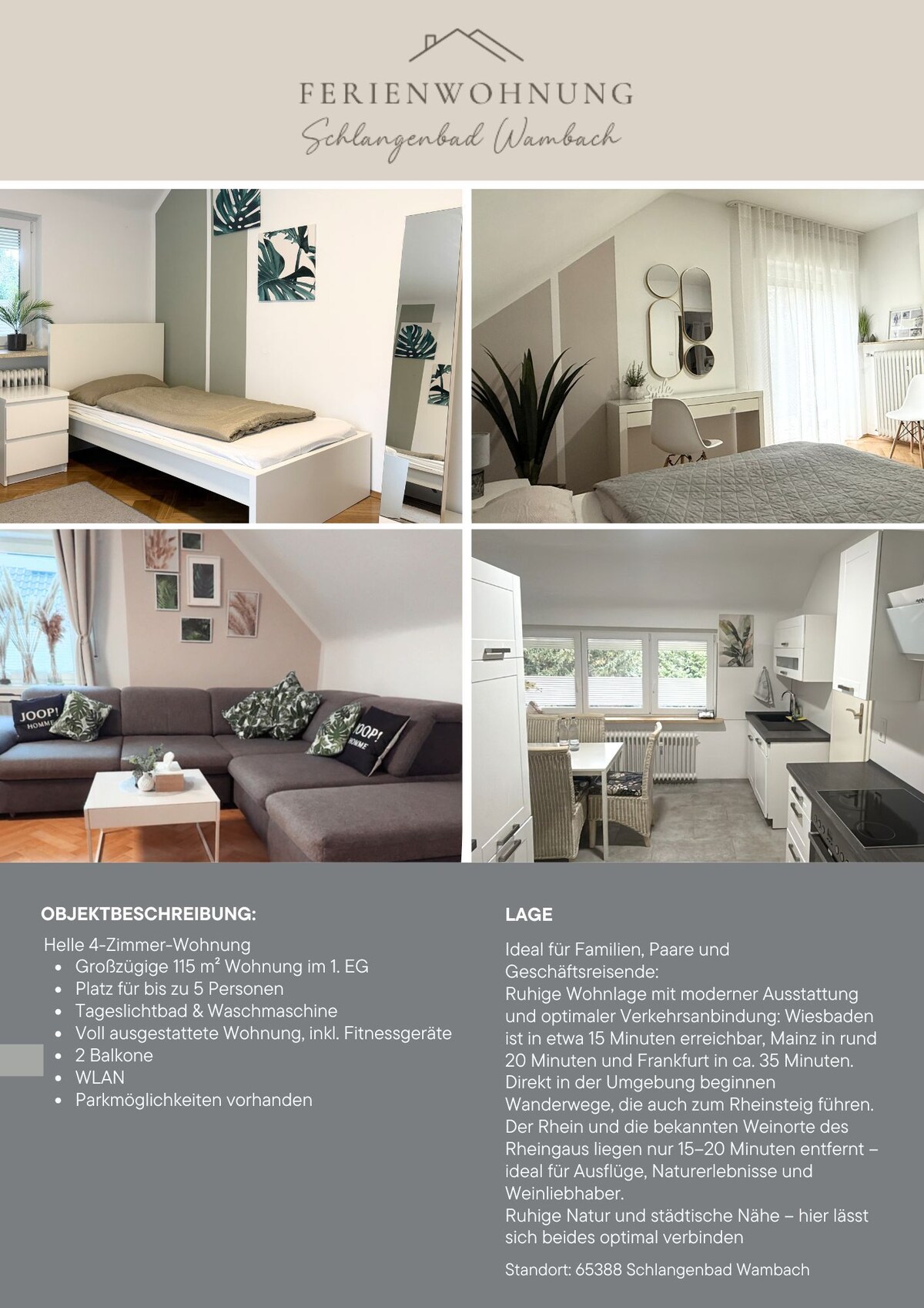 Welcome to an atmosphere that combines style and high-quality furnishings in a distinctive way. Spanning 230 square meters, you can expect spacious rooms that offer everything you need for a wonderful stay. The bright and sun-drenched house has been completely renovated and extends over two floors with its own garden. The spacious layout offers stylish living for up to 7 people in every season. Frankfurt and Wiesbaden are in the immediate vicinity.