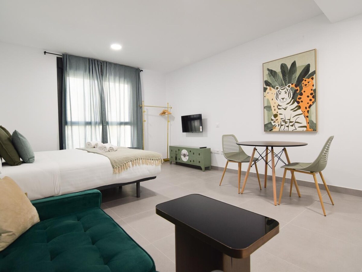 This exterior apartment, ideal for 4 guests, inspired by the light, coastline, and southern breeze of Cádiz. Its design pays tribute to the city’s white architecture, open patios, and subtle maritime touches reminiscent of the Bay of Cádiz. Bright, fresh, and relaxing, the space includes a cozy bedroom, private bathroom, fully equipped kitchen, and a dining area for your comfort.