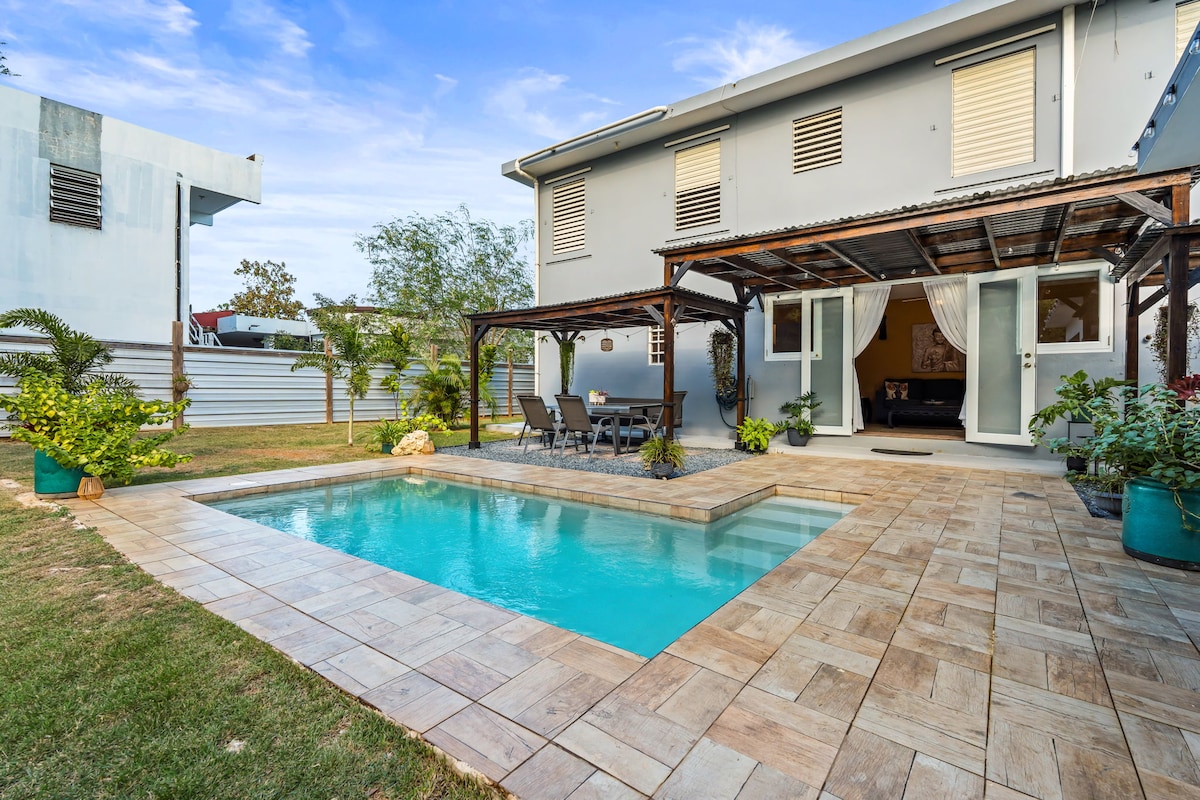 Relájate y disfruta de tus vacaciones en este espacio amplio y sereno. Siéntase libre de darse un chapuzón en una piscina completamente privada con area de estar al aire libre. Esta acogedora residencia con excelente ubicación, a 5min del Aeropuerto Rafael Hernández (Aguadilla), cerca de playas como: Crash Boat, Rompeolas, Parque Colon, 10 min Mall. Residencia: 3 dormitorios,2.5 baños en el interior, cocina,comedor, sala, family, wifi, Netflix,Piscina terraza, 2 medios banos,lavadora, secador