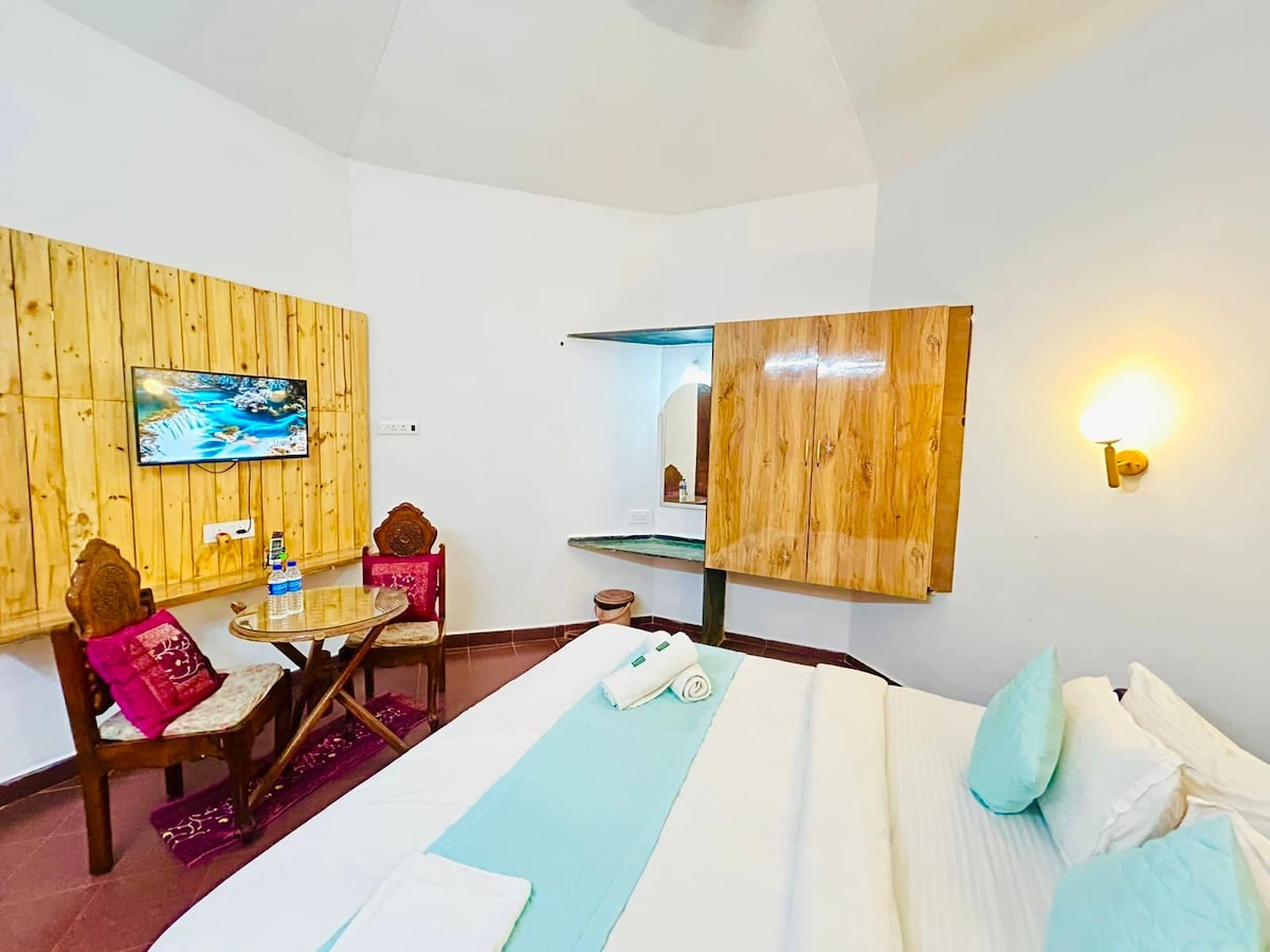 Escape to our delightful 2bhk flat nestled within a serene resort in Morjim. Surrounded by lush Goan greenery, this peaceful stay offers a perfect blend of comfort and nature. Well equipped with Wifi, 3 ACs, Smart TV, great lighting, power backup, stocked kitchen, cosy beds and 2 balconies to relax in. The apartment-resort features a garden, swimming pool, Games room, Gym, Restaurant and Spa! Moreover, you can just hop over to the river in a minute, for a peaceful walk or picnic.