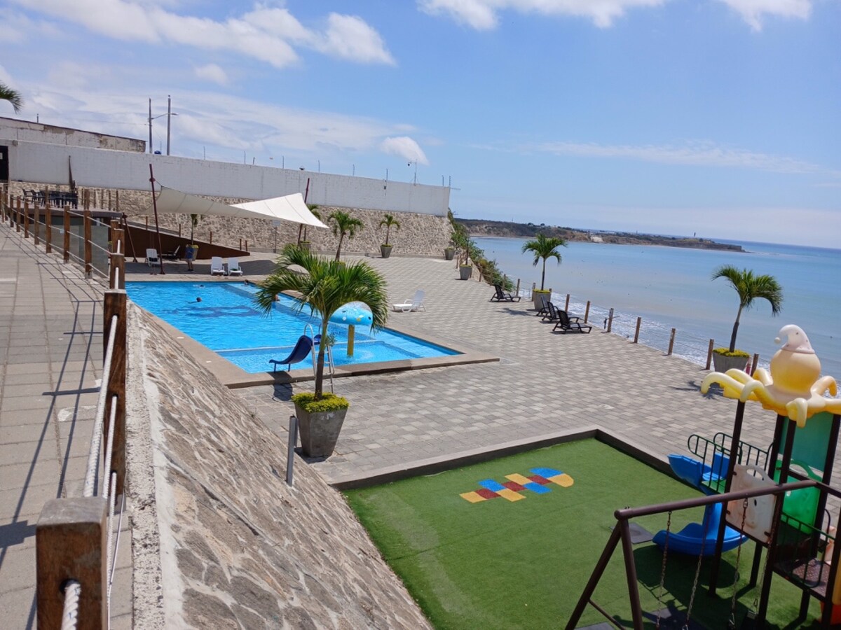 Enjoy the simplicity of a safe, centrally located place to stay in a private residential complex with a pool, on the first floor, for those looking for a place to rest or enjoy Manta. Ideal for tourists, professionals, or couples, close to the ground terminal, the airport, Paseo Shopping, downtown, El Espigón Park, Mall del Pacífico, and Los Esteros, Tarqui, and Murciélago beaches. 24/7 security, free parking. We look forward to welcoming you for a comfortable, stylish, and functional stay.