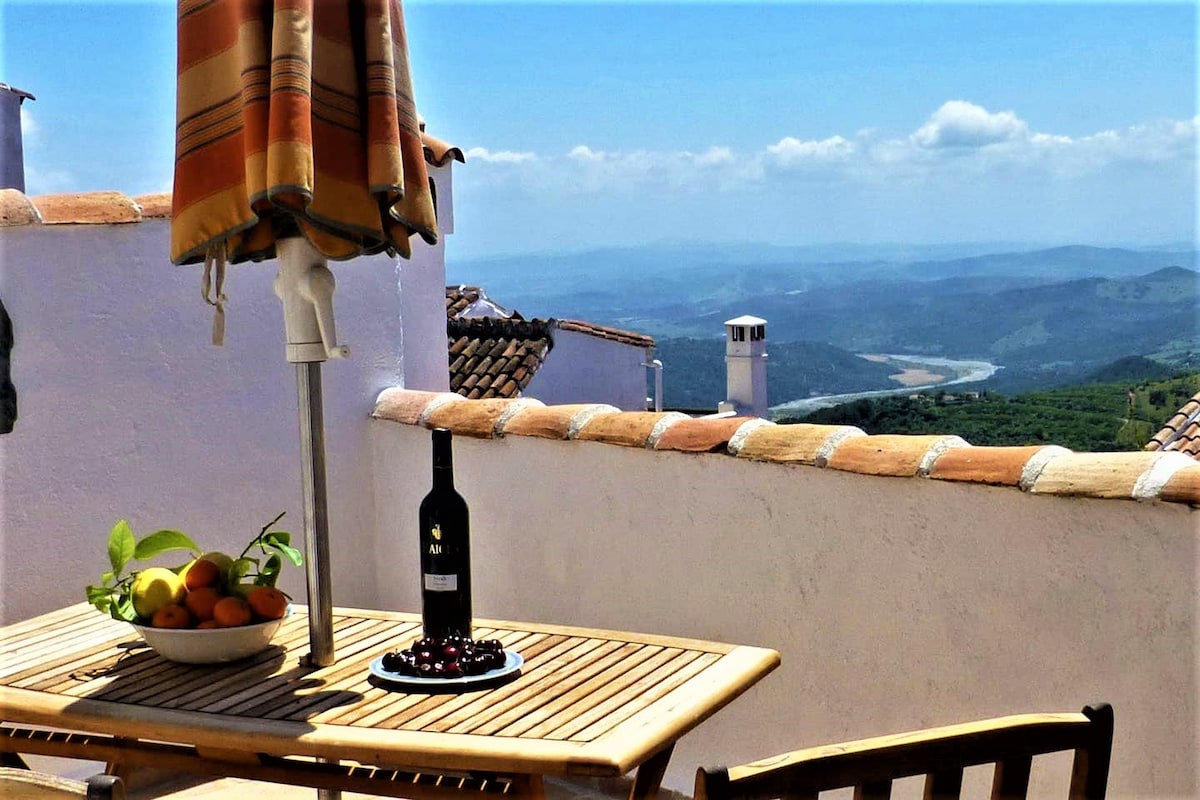 CALM, TRANQUILITY AND NATURE A cozy little stone, lime, and wooden house. Taken from the past so you can enjoy it and spend a few days full of peace and quiet. With space for two people, it has a living room with a fireplace, dining room, and fully stocked kitchen on the first floor. The room and bathroom, located in a beautiful attic, lead to a terrace where you can enjoy incredible views of the Valle del Genal.