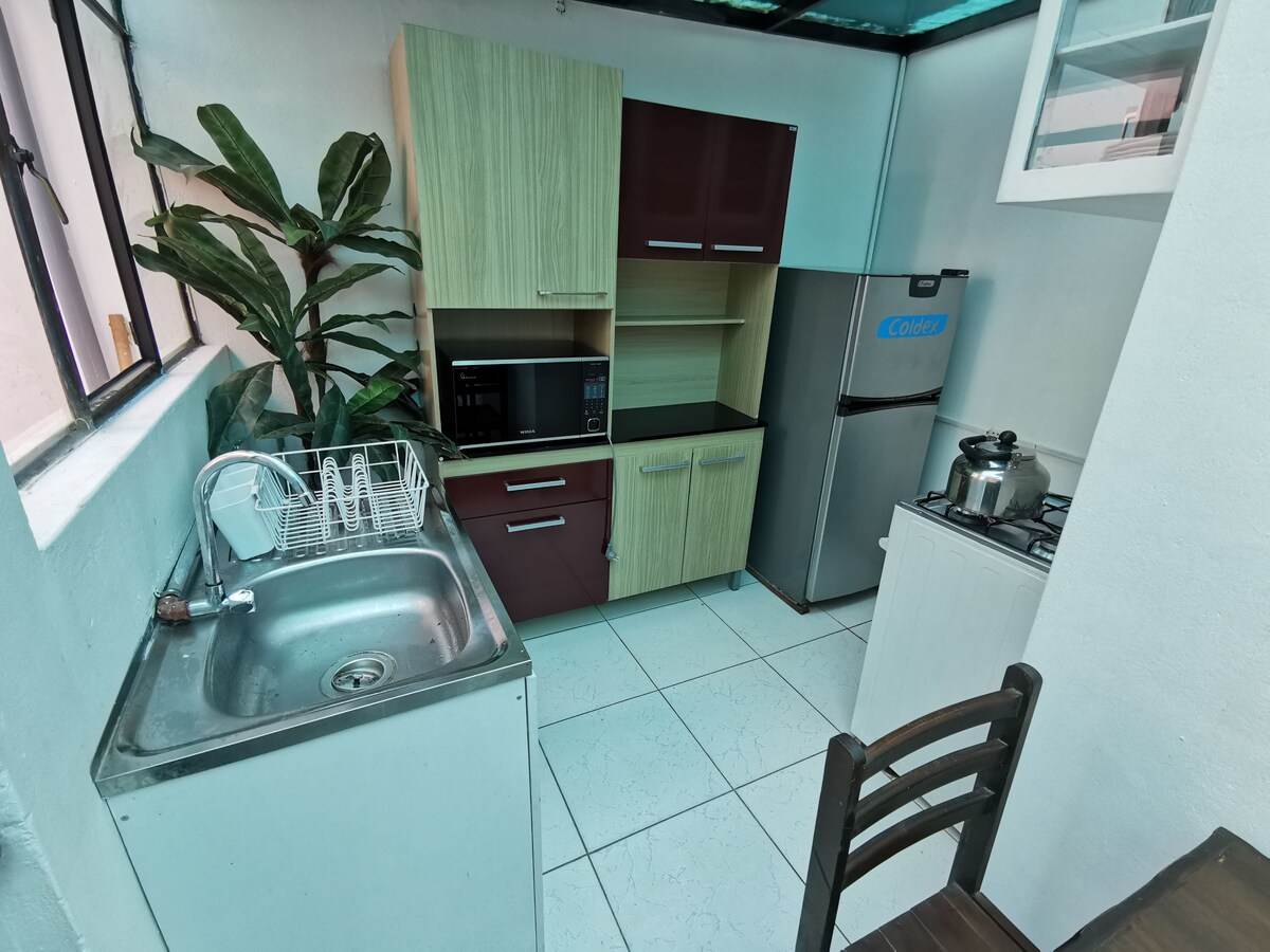 Departamento con acceso independiente (piso 4) a 10 minutos del centro histórico y a pasos de un centro comercial, restaurantes y transporte público. Muy bien equipado y ventilado con vistas al exterior, 2 camas Queen en ambas habitaciones y un sofá cama de 2 plazas para mayor comodidad. Cocina completamente equipada, un escritorio de trabajo en la sala, WiFi de alta velocidad y una lavandería con tendedero de ropa.