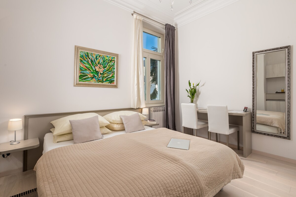 Cosy double room with private bathroom and balcony seawiev located in the very center of Opatija. It is new renovated, air conditioned with little fridge, wifi and tv. Close to the public transport, supermarket, green market, post office, banks, restaurants and bars. 3 min walk to the beach. Located on the second floor, old villa, no elevator. Beautiful seaside walk about 10 km long.