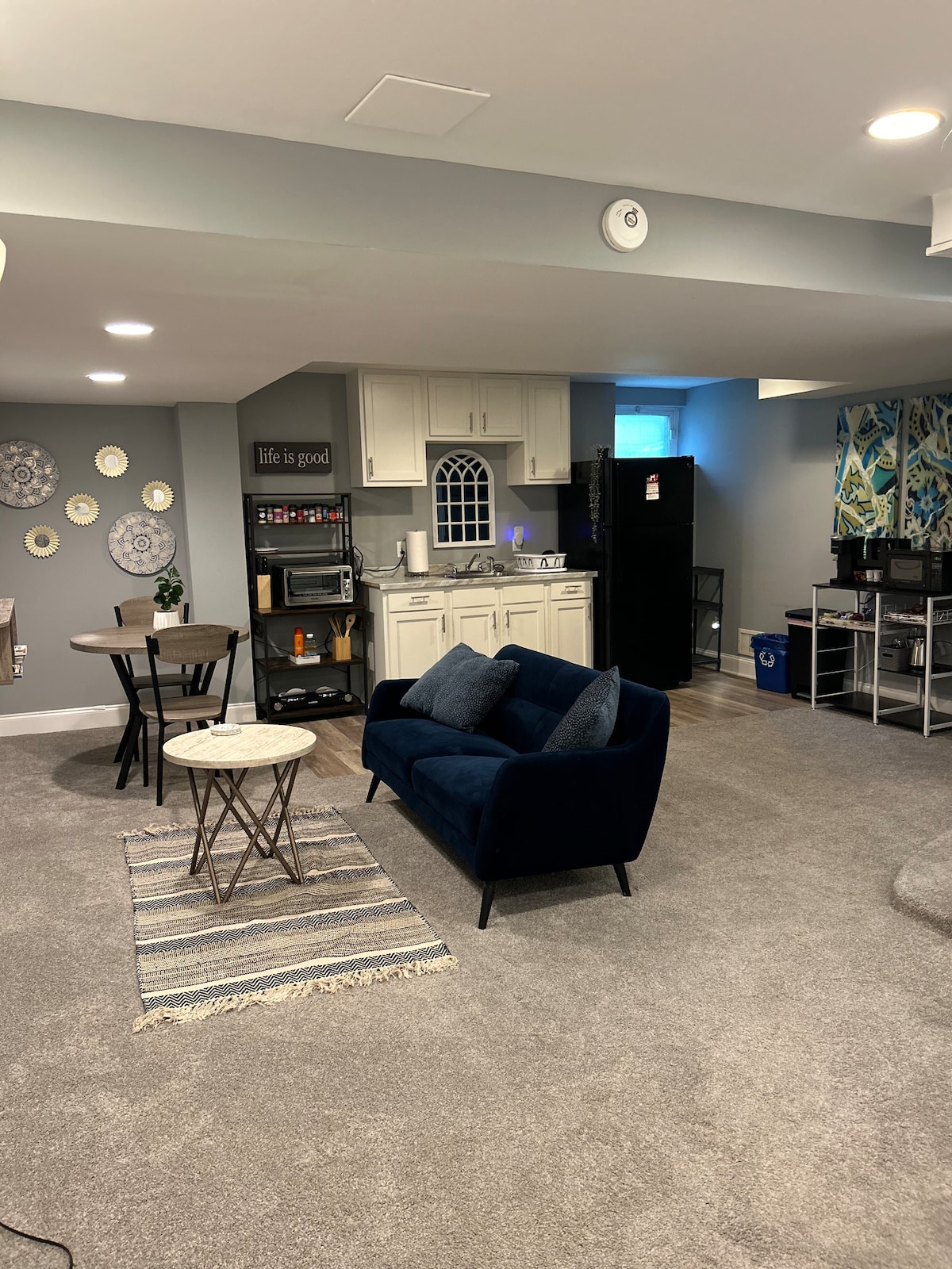 Stylish studio basement apartment located 3 minutes from UM Capital Region hospital. As you pull up to our quiet neighborhood you can park right in the drive. The entrance is around the corner to enter your private space. We offer all the essentials needed to have a relaxing stay. The full service kitchen is well equipped and inviting. A large over sized sink for a quick clean up. Come unwind after a long day in this private studio with rainshower and jets. Long stays are welcome.