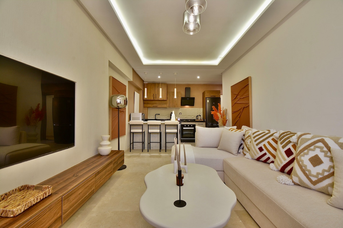 Bright luxurious appartment, and wonderful place to be for holidays, with it private garden at the most unique and central golf resort Prestigia in Marrakech. Located at only 5 minutes drive from Marrakech Menara airport and at 5 minutes drive from Gueliz city center and Médina Souks. At Prestigia resorts you will find peace, calm and for sure security as well as promixity to all distractions that you will absolutely need, as for shopping and entertainment (golf, clubs, restaurants, cinema…)