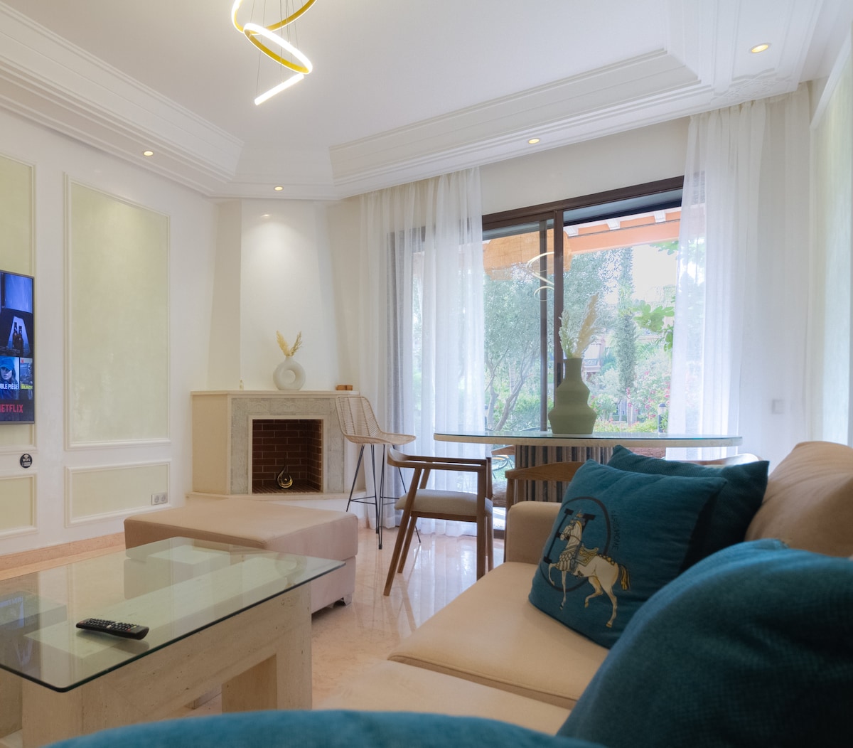 Our apartment is conveniently located in the heart of Marrakech. The train station, numerous cafes, restaurants, grocery stores, and supermarkets are all within walking distance. The airport is just a 12-minute drive away, making it ideal for travelers. • The property offers High-speed Wi-Fi, Netflix & IPTV, air conditioning, an indoor pool, a fitness center, private, covered parking, and 24/7 security & surveillance.