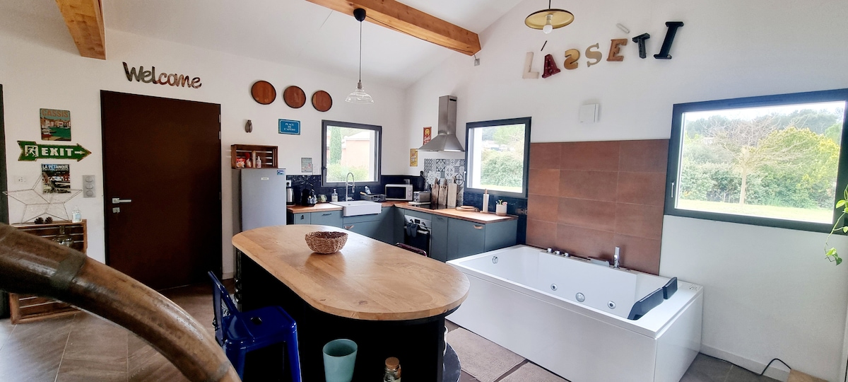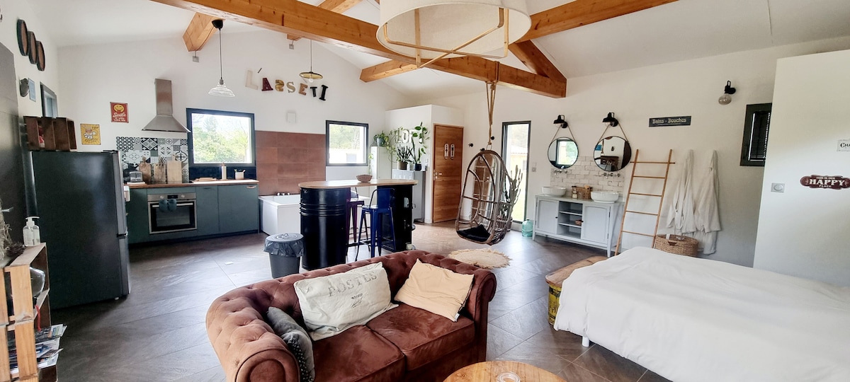 Just 10 minutes from Cassis and its coves, in a small village, a new 50-m² loft-style house with exposed beams and a pétanque court (pétanque balls provided)! New hydromassage bathtub with room for two (bubbles, lights, and heating element), fully equipped kitchen, walk-in shower, and a 35 m² terrace surrounded by pine trees. WiFi. Highway 5 min. But also, close to Marseille, La Ciotat, Bandol. Perfect for a romantic weekend, relaxation guaranteed.