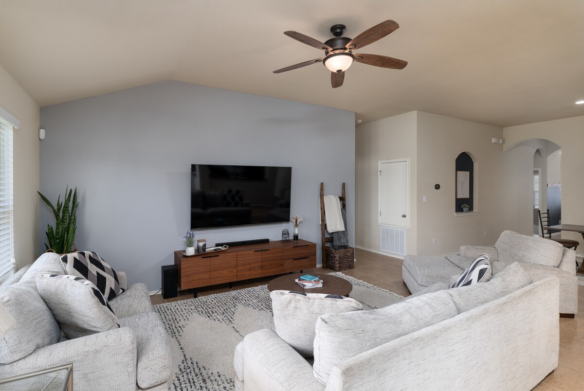 Welcome to your new home away from home! This oasis is conveniently located 20 minutes from Austin, 45 minutes from San Antonio, and 10 minutes from San Marcos. Enjoy the nearby food trucks, or let the kids have a blast at the playground, or the neighborhood pool. The stylish interior comes with modern comforts like a 75" TV, internet, games, outdoor patio, fire pit, & more. You'll be less than a mile from the Hospital & minutes to restaurants, shops, H-E-B, dog park, & the I-35 freeway.