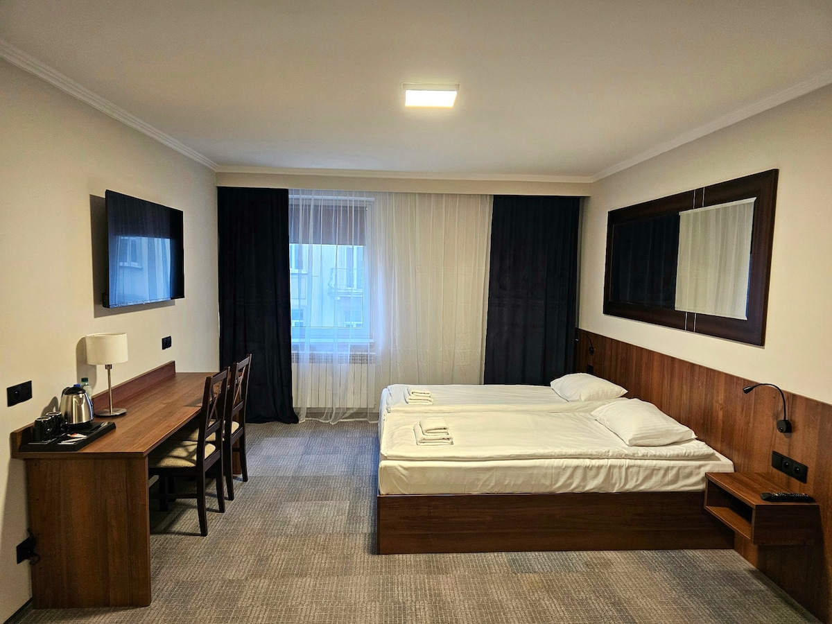 Our Twin Room is 16 m² and features two twin beds, a sitting area, and heating. The private ensuite includes a shower, eco-friendly toiletries, a hair dryer, and fresh towels. Stay connected with free Wi-Fi and unwind with a flat-screen TV with satellite channels. Pet-friendly, and an iron is available on request.