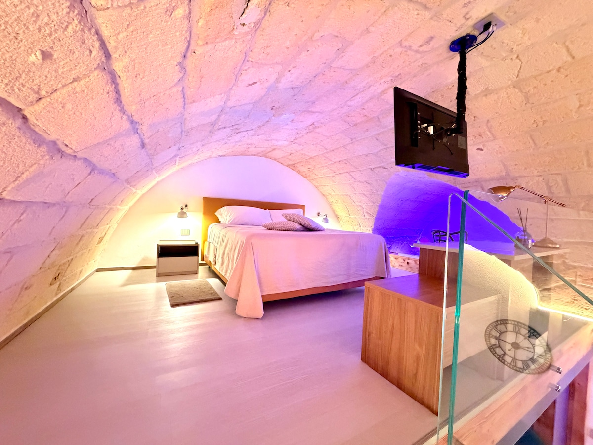 Independent suite with private hot tub. 68 sqm suite under a stunning stone vault, featuring a whirlpool bath carved into the rock and a private entrance. Two-level space with a fully equipped kitchen, living area with sofa bed, and mezzanine. Intimate sleeping area with a king-size Dorelan bed for high-quality rest. Natural light and fresh air thanks to an integrated opening. Unique atmosphere, privacy, and comfort, near Matera, Bari, and the Itria Valley.