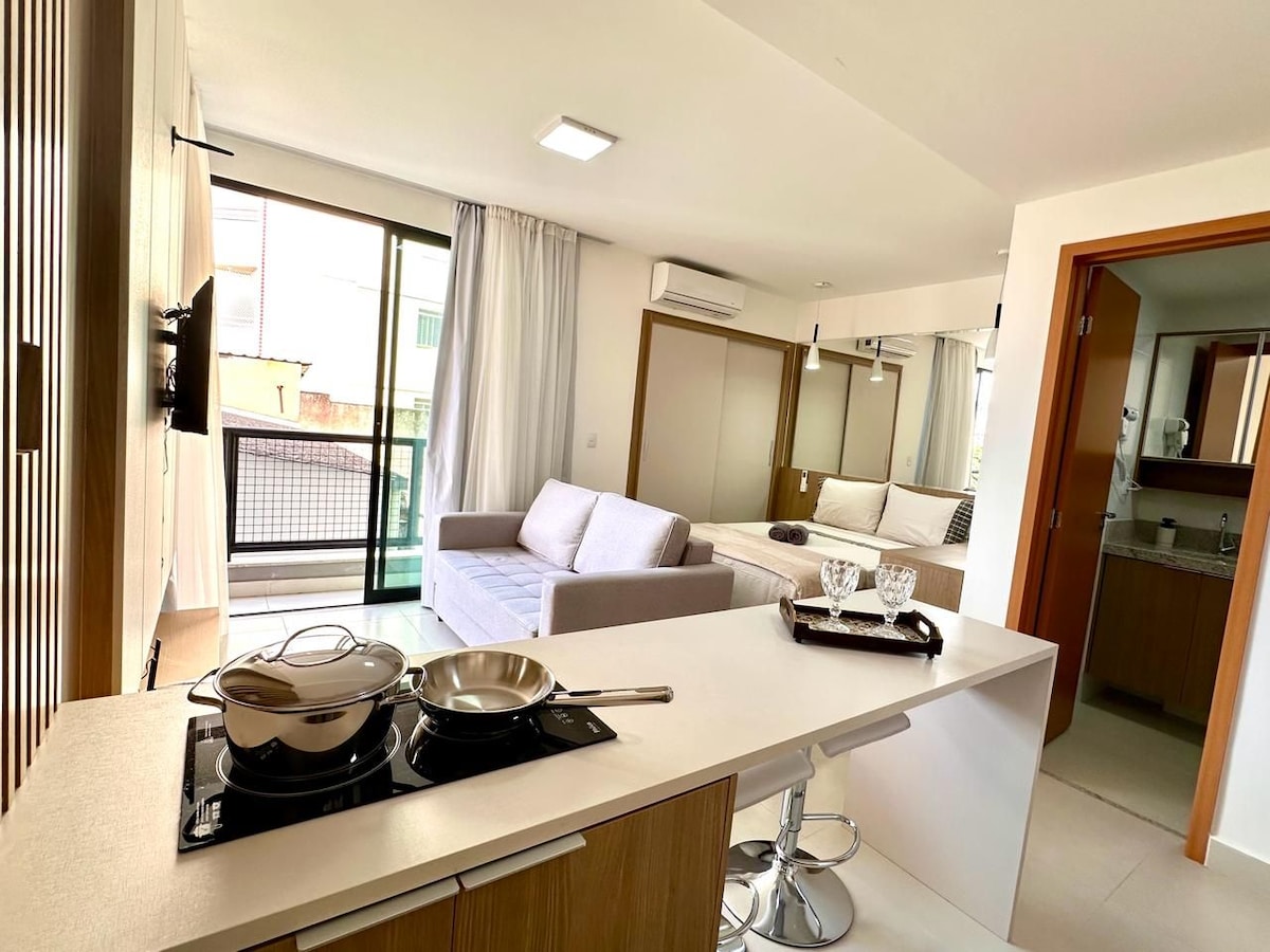 New Studio apartment with garage. All new furniture and designed to bring maximum comfort to our guests. Very well located with everything close by, in the middle of Av. Itamar Franco, almost on the corner of Av. Br. Rio Branco in the heart of the city! Ideal for your home office combined with leisure! With a complete leisure area with swimming pool, fitness center, gourmet area, coworking, kids space and laundry. Enjoy an unparalleled experience in this well-located Studio with a garage!!