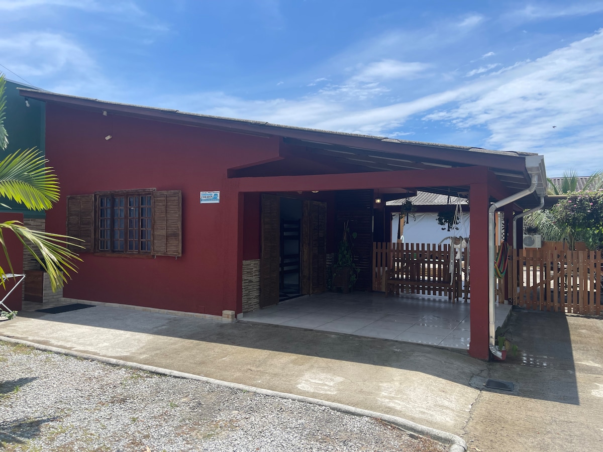 A spacious, rustic and nostalgic house! With a pop-art decor, the space combines colors and textures and is close to the beach and shopping! Great for enjoying a barbecue, enjoying the wood stove or relaxing on the sofas, armchairs or hammocks distributed throughout the house. It has a yard, fire pit, Wi-Fi and TV. Located near the Verão Maior Paraná Concert Arena! ATTENTION: It does not offer bed and bath linens. Pillows and mattresses are offered with protective covers. NOTE: Wooden house with steps.