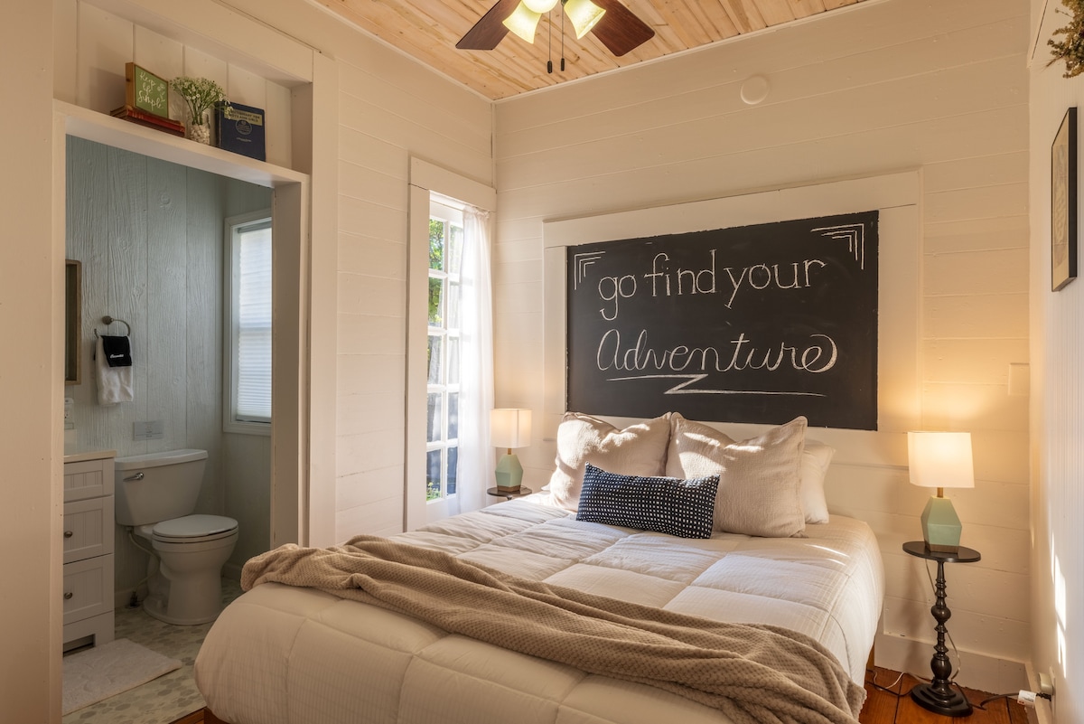 Wake up to a view of a 19th-century gristmill right outside your window — then walk across the street to explore it. The Rock Mill Farmhouse is a thoughtfully renovated 1846 home that was once the dwelling of the mill's keeper, and it still carries that history in every room: exposed original siding and beams, a winding staircase, an original A-frame ceiling in the upstairs bedroom, and a few charmingly low doorways that keep tall guests humble.