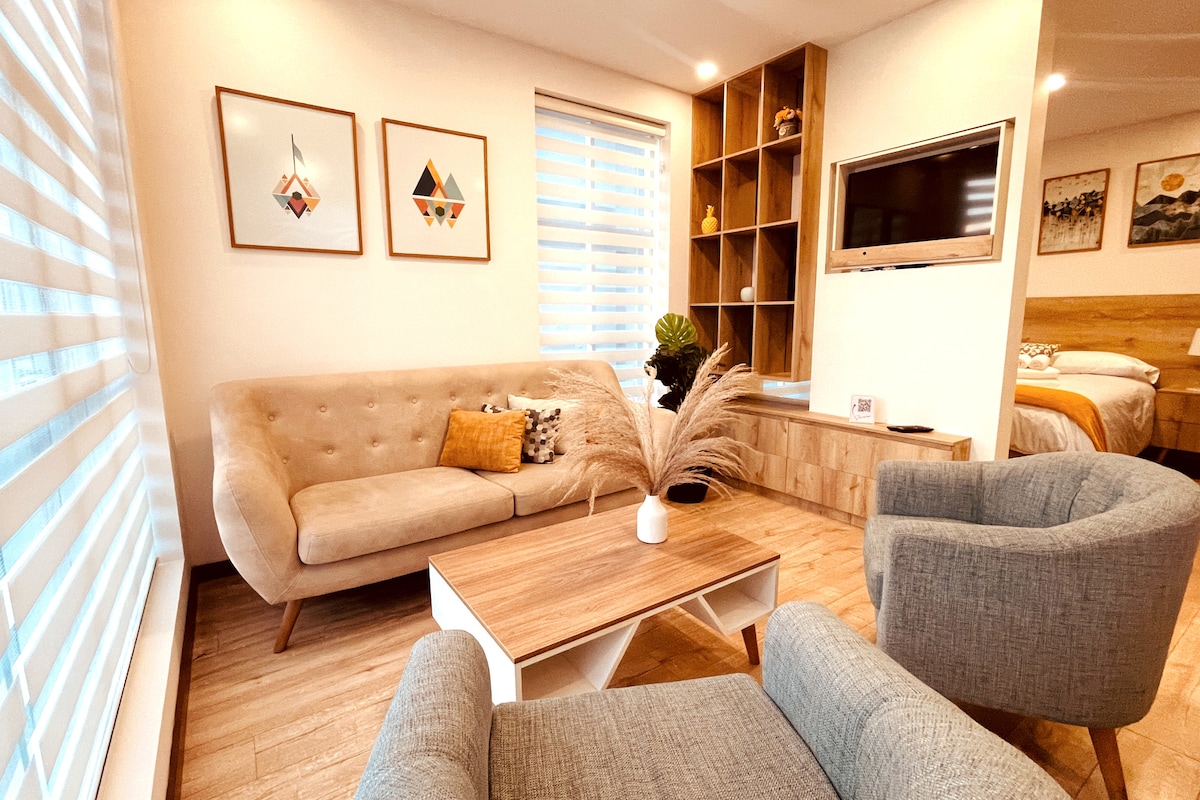 Enjoy this modern and impeccable 1-bedroom apartment located in the San Miguel area. Minimalist decor, comfortable bed, equipped kitchen and guaranteed cleanliness. Secure access with digital code and entry card. Bright, cozy and impeccable, located on the 6th floor and strategically located near restaurants, supermarket, shops and transportation. Ideal for couples or travelers looking for comfort, safety and style in every detail.