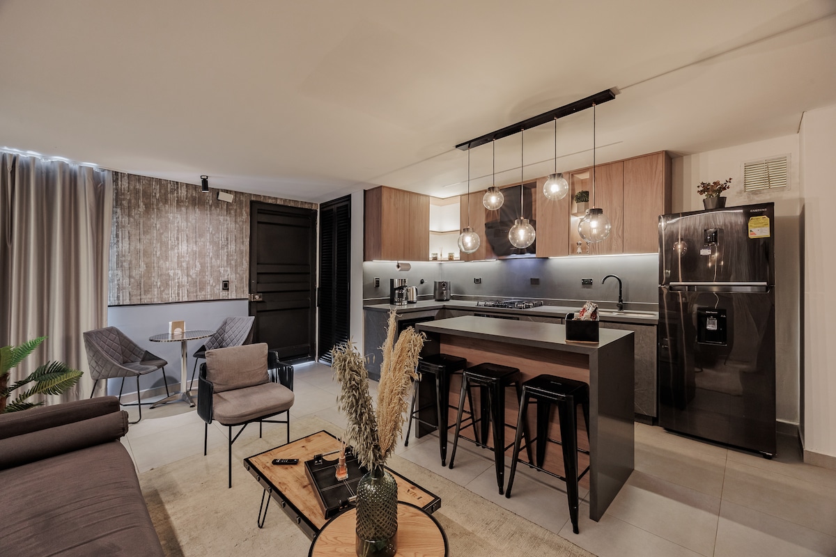 Modern apartment on the 17th floor of Hotel Urban Studios with amazing Medellin views. Just a 10-minute walk to Tesoro Mall and close to top nightlife, yet in a calm and pleasant area. Features a comfortable King bed, full kitchen, A/C, washing machine, gas dryer, fast Wi-Fi, and access to Al Alma restaurant with room service. The building includes a pool, jacuzzi, gym, work rooms and 24/7 security.