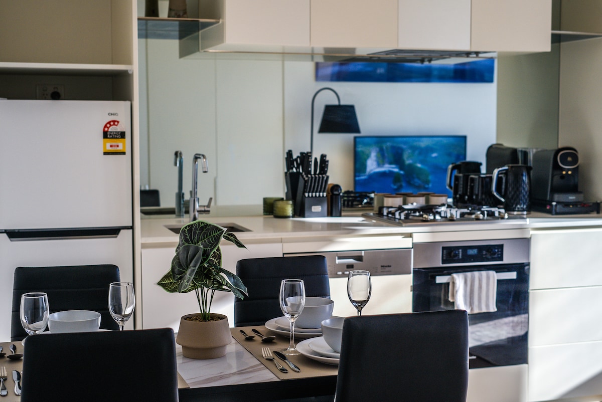 This is my personal home, somewhere I live between travels, which is exactly why it feels like a genuine home away from home rather than a generic rental. The plants, the pantry, the little touches: they're all here because someone actually cares about this space. Light-filled and characterful, with lush indoor plants, a private balcony facing a quiet tree-lined street, and access to a shared sixth-floor rooftop with Melbourne city views, BBQ and fireplace.