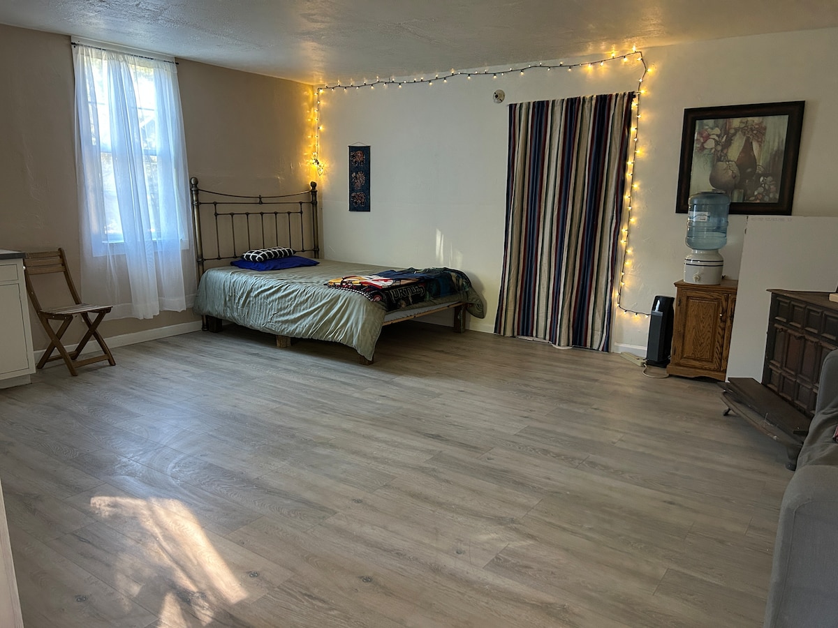 A guest suite downstairs-totally separate from upstairs w/a nice garden outside. You walk down a gravel & brick path to enter @ ground level. It is a large studio w/old growth beams & full length windows, kitchen area, bathroom w/ a jacuzzi tub. There is a Paul Bunyan California King size bed w/ steps, w/no railings. Much room to roam. The outside yard is shared space, yet, we don’t walk in front of your windows & will respect your privacy. There’s a garden & fruit trees to graze in season.