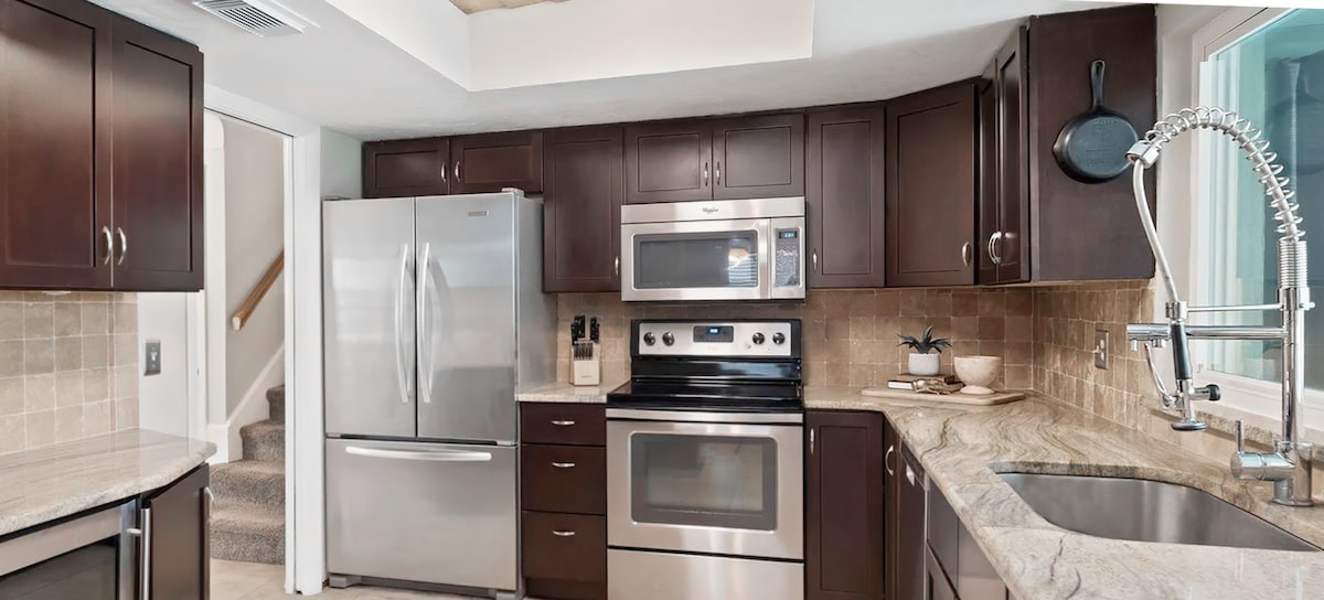 Renovated Coastal Retreat in the Heart of Downtown Cocoa Beach Welcome to a fully renovated, SPACIOUS two-story home with fenced-in yard in the most walkable part of downtown Cocoa Beach. 0.3mi from the beach, one block off Minutemen Cwy, & steps from the area’s best nightlife, coffee, kava, yoga, restaurants + bars, this location puts everything within easy reach. Designed for comfort, longer stays, and real livability, the space blends coastal boho style with luxury finishes throughout.
