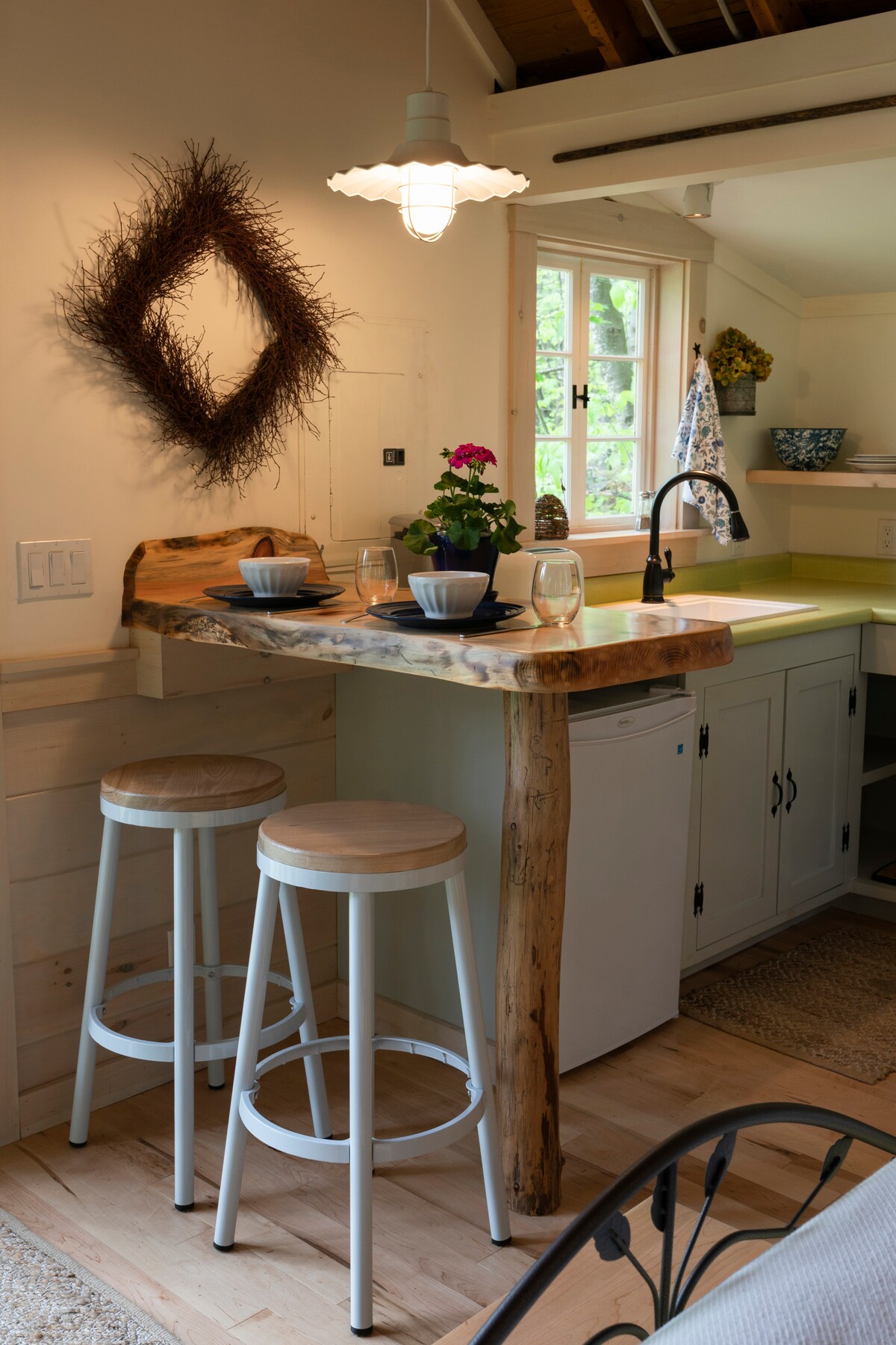 We built the Wren Cabin to be a serene space filled with light and art and with lots of cozy details. Lofted ceilings, a spiral staircase and large open concept with lofted bedroom. The cabin also has a gorgeous wood-fired sauna for those colder days. Wren cabin has a large wraparound deck for relaxing and an outdoor fire pit, as well as shared access to Adams Pond. The space is modern Scandinavian, light and aery, and filled with thoughtful details.