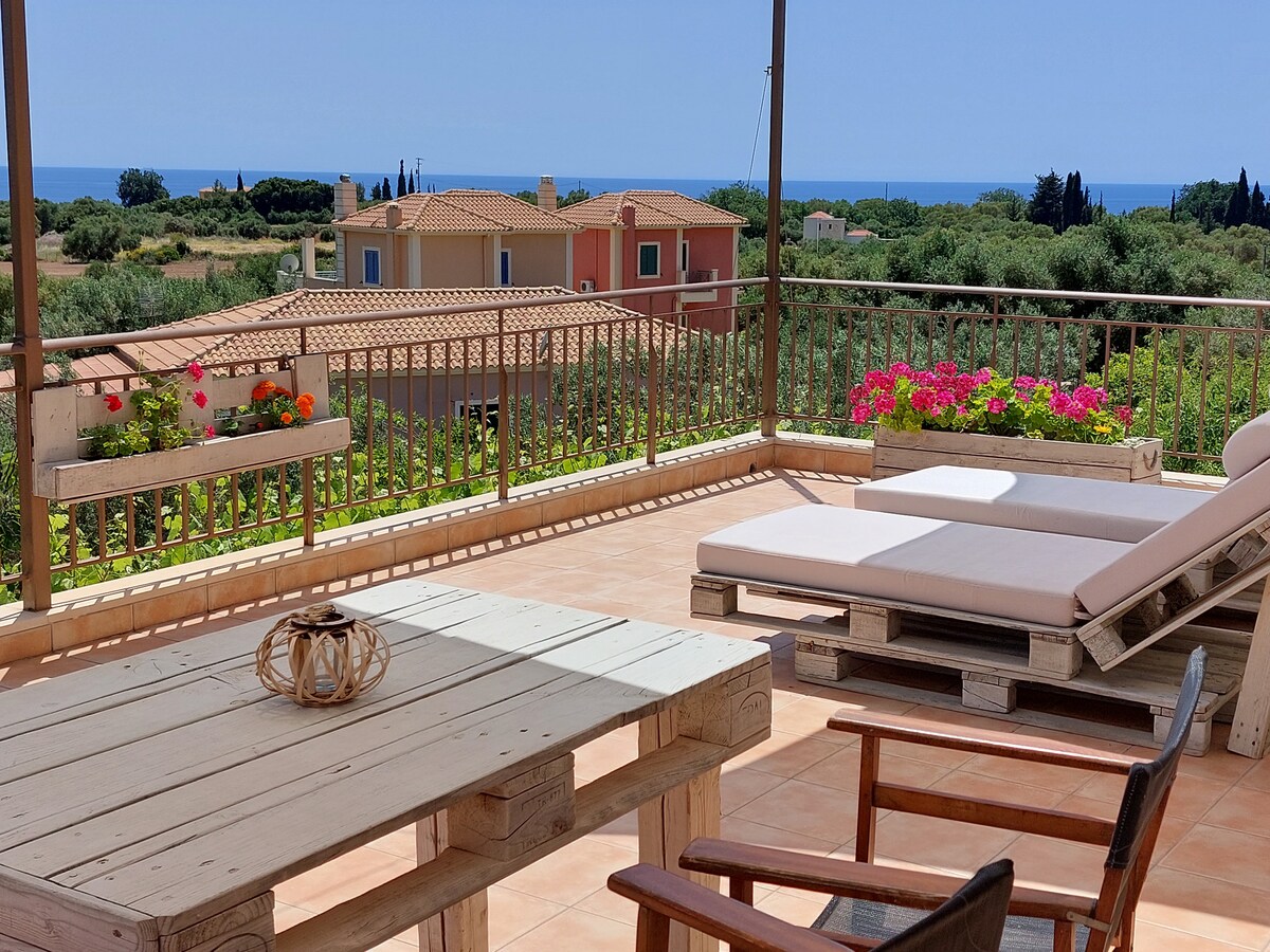 Discover a Mediterranean themed escape at this rustic designed modern home. The holiday retreat features wood furnishings and decor, blue hues throughout, contrasting motifs, and access to a communal garden with a BBQ. Just at the outskirts of the pretty hamlet of Svoronata, with views of Zante, the Ionian Sea and surrounding countryside, this charming, 50 sqm, 1st-floor residence, enjoys a tranquil location, very close to the airport, but quiet and perfect for a relaxing, romantic holiday for two or three. Sitting in an elevated position, it dominates splendid views from its' spacious terrace The private terrace of 45 sqm, located just in front of the apartment and the lovely garden underneath, with its' barbeque, create a wonderful setting for breakfast, coffee or meals. Although it is built in the common garden of the hosts’ permanent residence at the ground floor, it stands at the whole 1st floor itself, which is autonomous and shields guests from the house beneath it and there are no immediate neighbors overlooking the property. Patio doors allow plenty of light to flood into the open plan lounge with a sofa-double bed, dining and kitchen area. The comfortable double bedroom, with a king size bed, also has patio doors out to the furnished terrace at the front of the property. A bathroom is located two steps across the bedroom door, together with a kitchen with all the necessary utensils. The lovely garden at the ground floor and the barbeque are in common use with the hosts. The terrace of the 1st floor is private, for guests' use only. The hosts are everyday willing to help you spend unforgettable holidays. Their permanent residence is located at the ground floor. They moved to the island of Kefalonia in 2006. George is an Electrical Engineer. He likes the countryside, windsurfing, sailing and tennis. Sofia is working. She likes cooking, paragliding, excursions and traveling. They have two children. The house is 8 kilometers away from the capital of the island, Argostoli, and only 1 kilometer from the airport and the sea. A short 5-10 minute drive away are several of the island's most famous beaches, Ammes, Avithos, Ai Helis, Makris Gialos and Platis Gialos. They are located two to five kilometers away from this lovely residence. There are also markets, taverns, and shops nearby. A welcome basket of fresh fruits, juice, as well as a bottle of wine, will be offered to the guests upon their arrival.