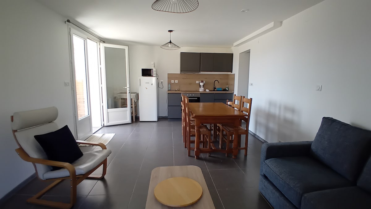 Gite 38 m2 in a residential area, bright and comfortable, under the owner's accommodation, without any vis-à-vis. Separate entrance, private parking. Fully equipped and linen provided. Covered terrace, dining area in the garden facing Ste Victoire. 15 minutes from Aix and 30 minutes from the coves (sea). Bus stop 50 meters away. Location close to motorways, many tourist sites and the village. Great for vacationers or business travelers on the go.