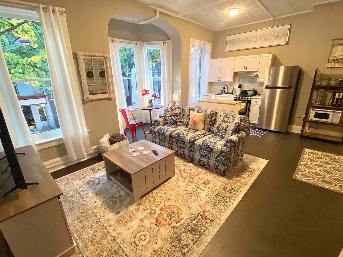 Within footsteps to Carroll Creek Promenade offering easy access to posh restaurants, fun Breweries, local shops and festivals galore! Modern remodel and furniture including a memory foam king bed. Enjoy your own apartment w/ wide open spaces & high ceilings that bring in fantastic light. Historic bldg. (circa 1840) with all the modern appointments to make your stay super comfortable & fun! Owners provide advice on their favorite places & restaurants! Easy self checkin. Free parking on site.