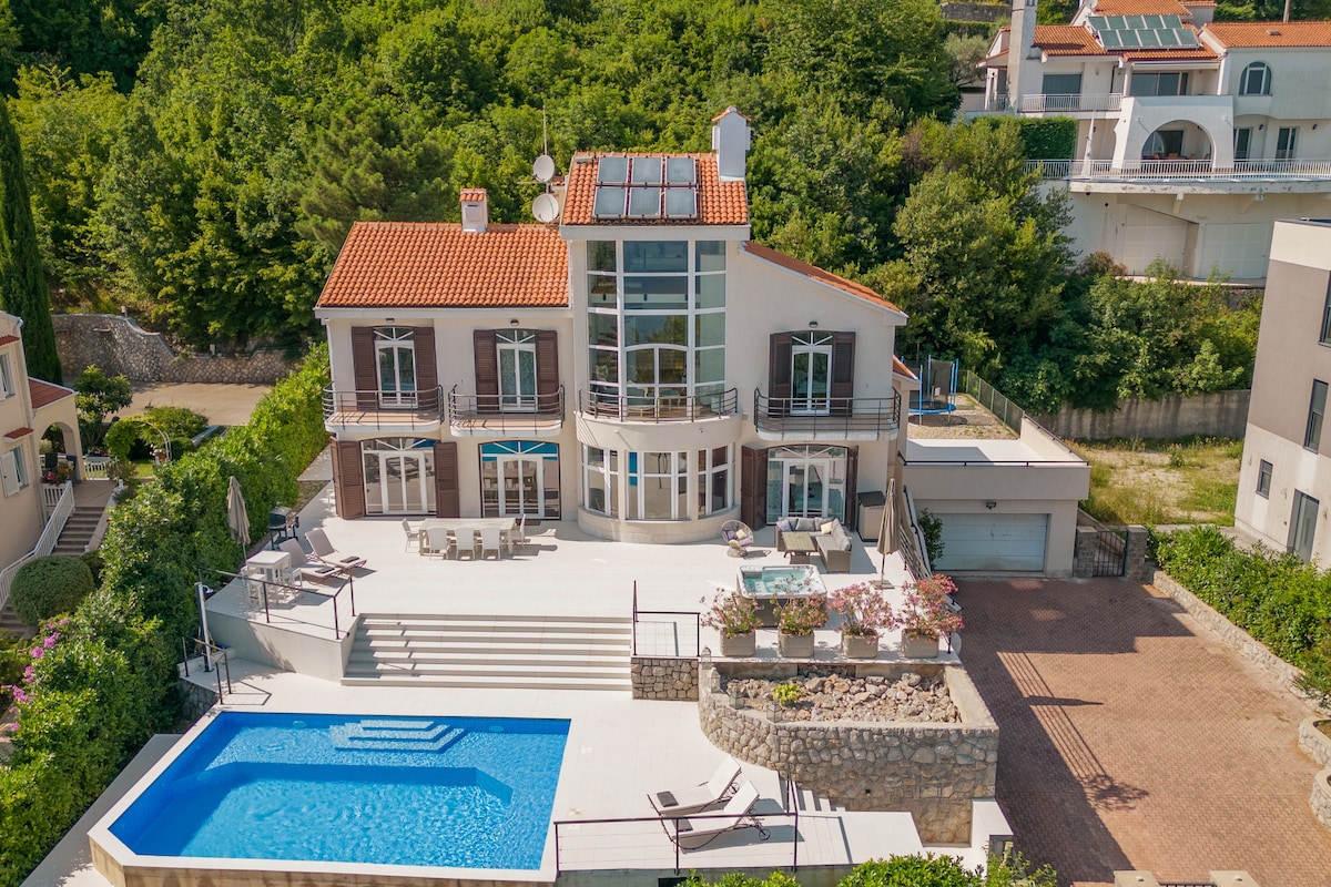 This gorgeous Villa is located on a hill above Opatija. It can accommodate up to 10 people and is perfect for families, a group of friends or couples. This luxurious Villa will make you fall in love in it's open space stylish interior full of real eye-catching details, but most off all the breathtaking view of the sea and complete Kvarner Bay. The Villa has wonderful 5 bedrooms with panoramic Seaview, each has own bathroom and walk in closet. There is also a barbecue, private parking for 5cars.