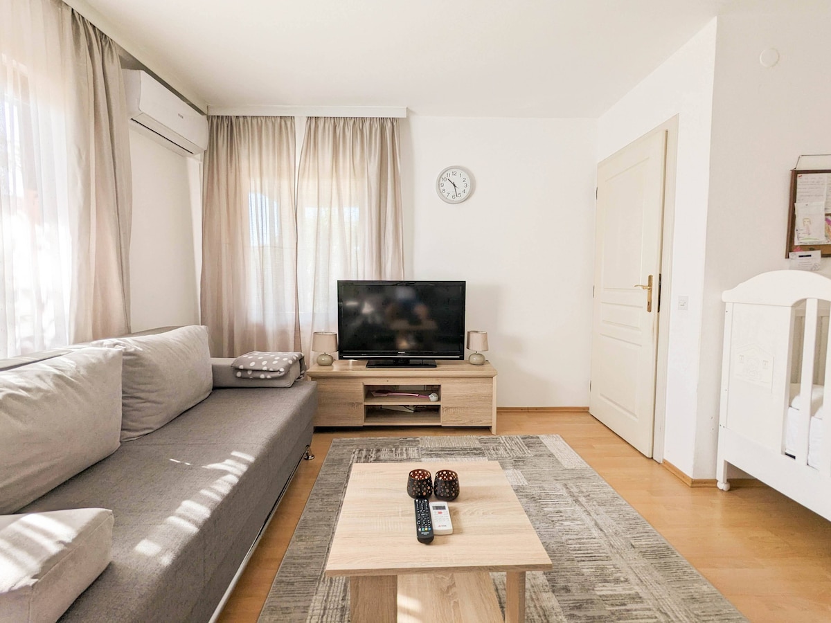 🏡 Warm and modern apartment for a comfortable stay Enjoy a cozy and beautifully decorated apartment that exudes warmth and comfort. The living room with comfortable corner furniture and ambient light is ideal for relaxing, while the modern kitchen is fully equipped for all your needs. Decorative details, plants and warm tones create a pleasant atmosphere, and the air conditioning provides comfort throughout the year.