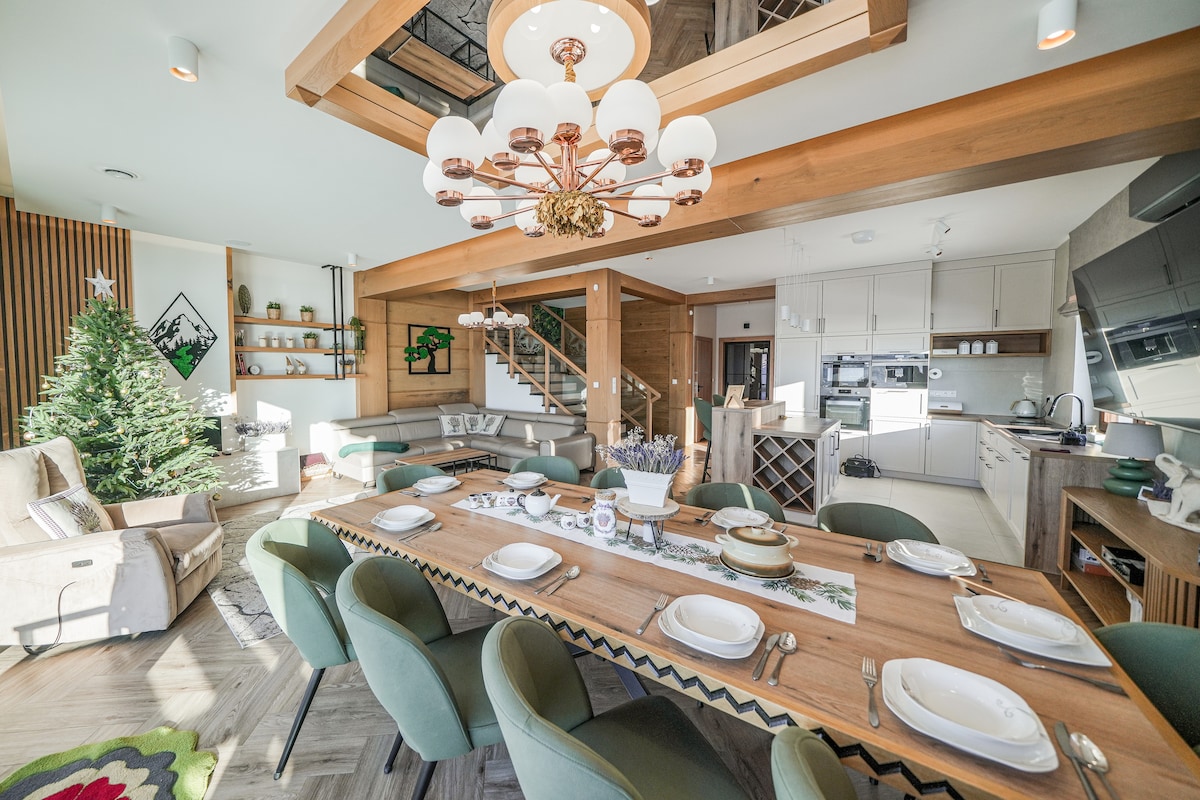 Grand Chalet is a luxurious 250 sqm villa in the heart of Podhale with a panoramic view of the Tatra Mountains. Guests can enjoy: 4 air-conditioned bedrooms, 4 bathrooms, a jacuzzi with a view, a sauna, a game room with billiards and PS5, a fitness area, a fiber optic work room, a children's corner, a fireplace and a year-round barbecue. The villa offers comfortable accommodation for 10 people. The perfect place for a family holiday, meeting friends or a workation – comfort, modernity and a unique atmosphere in one.
