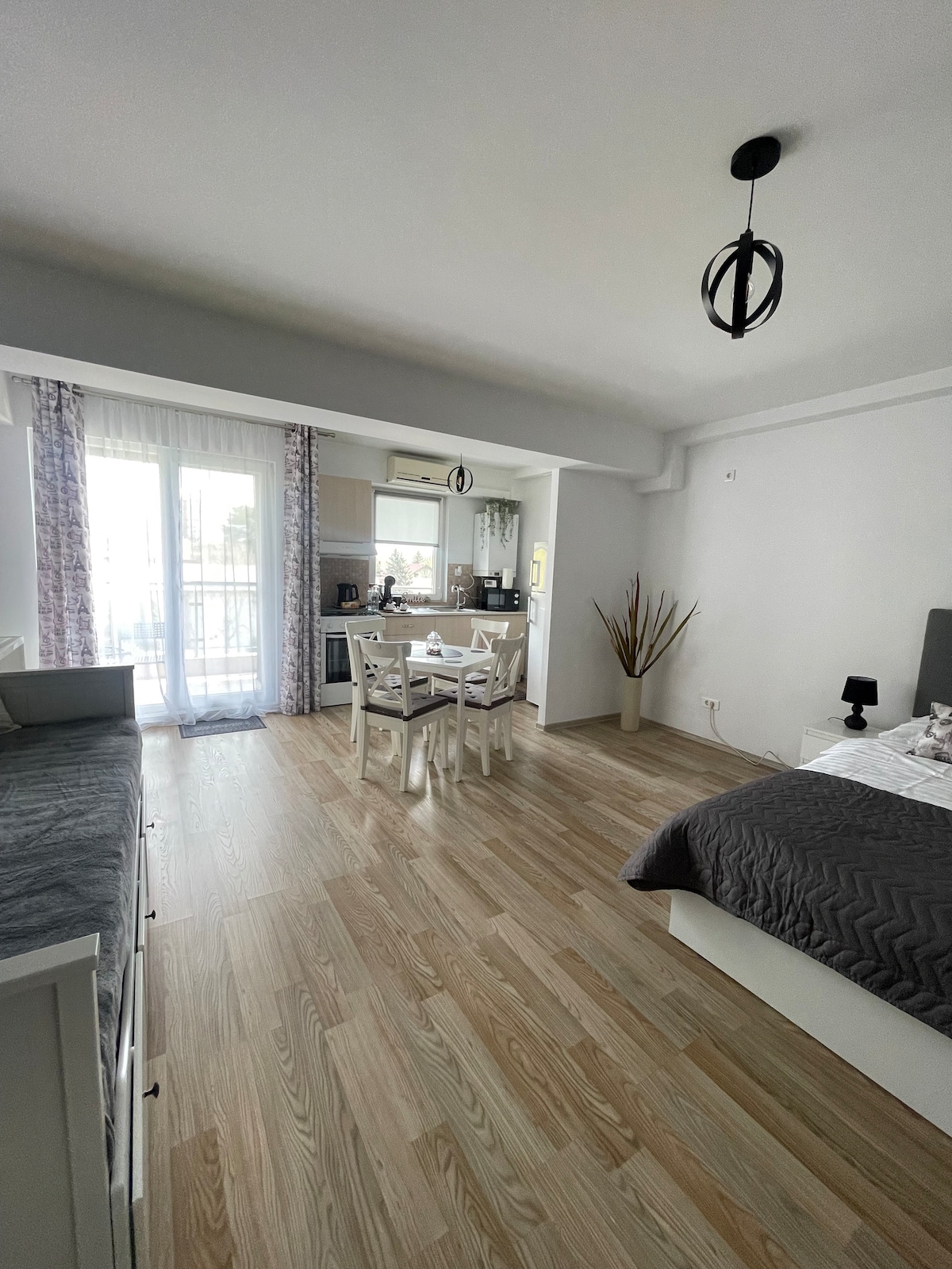 The place you need for a morning flight, a stopover or relaxing days at Therme Bucharest. We provide you with a studio apartment in a quiet location, located 5 minutes from "Henri Coandă" International Airport. It is centrally located in the city of Otopeni, with access to all points of interest in the city. (Therme Buc. Swimming Complex, Amethyst Center, Țiriac Collection) The apartment is located in a cozy building with only 9 apartments, courtyard and private parking.