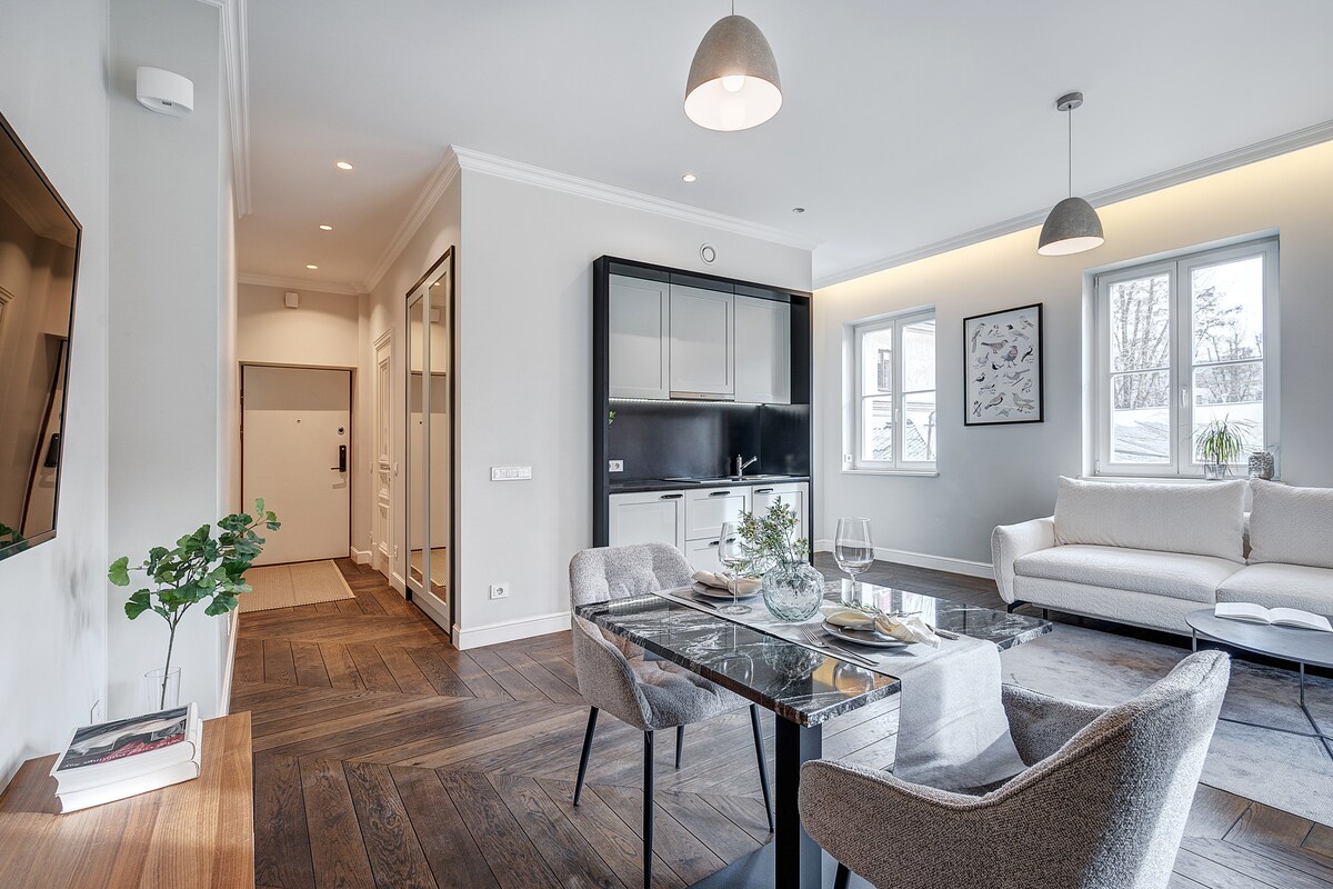 Live Square Court Apartments Fully equipped apartment for rent in the center of Vilnius - Gediminas Avenue near Lukiškių sq. Stylishly furnished and in a very convenient location in the very center of Vilnius! 53 sq. m., Gedimino ave. 44, fully furnished and equipped, 4/4 floor, has a roof terrace overlooking Gedimino Ave. and Lukiškių sq.