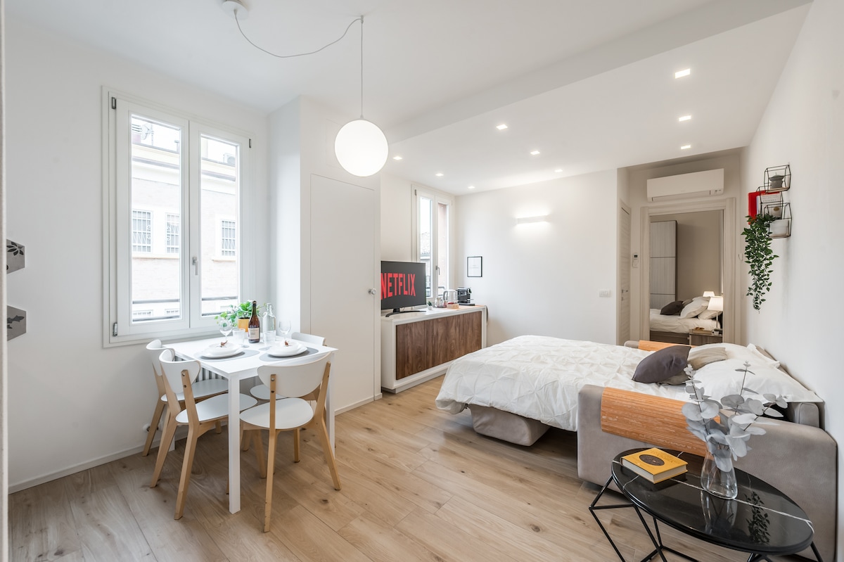 ★★★ FREE PARKING ★★★ Experience refined comfort in the heart of Modena. This elegant 60 sqm residence, newly renovated and set within a prestigious historic building, is just steps from the Military Academy, Central Station, and Old Town. Perfect for discerning families and business guests, it offers a garden view and luxury touches: 55" UHD 4K Smart TV with Netflix, underfloor heating, A/C, ultra-fast Wi-Fi, induction cooking, dishwasher, and washer-dryer.