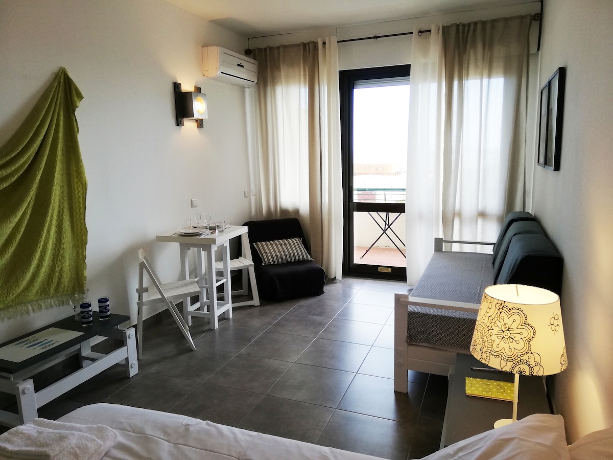 Studio apartment located on the 1st line of construction with a full panoramic view over Monte Gordo Bay (Algarve). Equipped to allow you to spend some beautiful days of rest. Ideal for couples and weekend getaways. On the spacious balcony you can enjoy a relaxing moment during breakfast or a drink in the late afternoon. Supermarket on the block and many restaurants/bars and a casino within a 200-meter radius. Parking lots in front of the building.